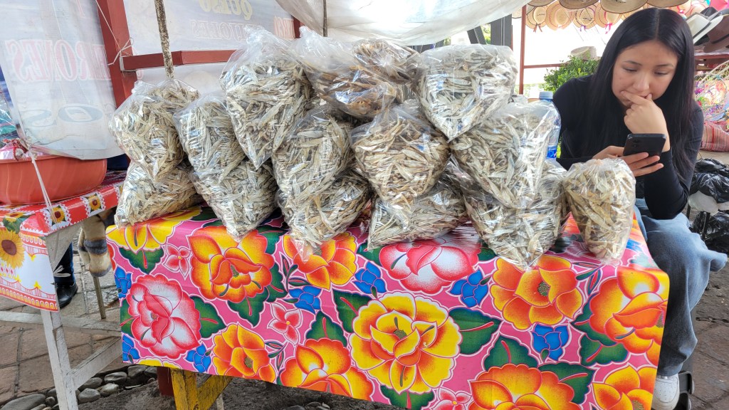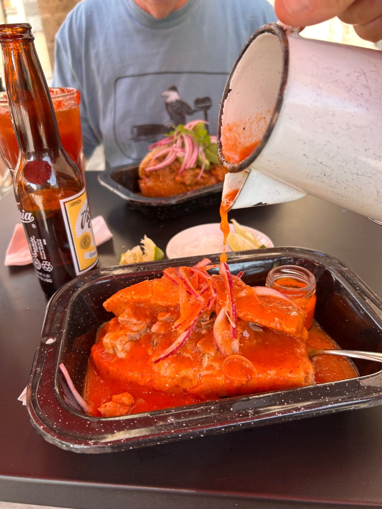 While driving we saw a woman pulling steaming hot tamales out of a huge pot. We screeched to a stop and bought two stuffed with masa and chicken “pollo” pronounced poyo and two pork. After eating all day, those went in the freezer in the casita until it was worked into a dinner later.