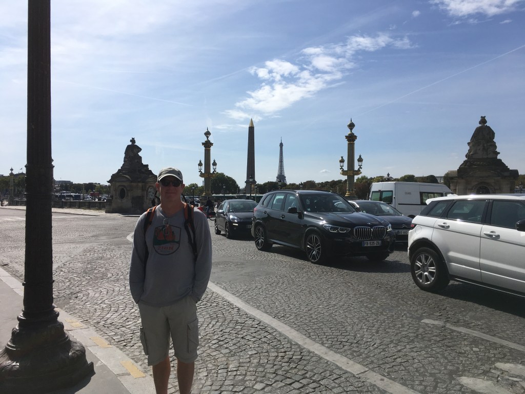 We got our little map and we were off to the historical portion of the castle that is “The Louvre”. Meters below the surface are the foundations of the castle’s beginning and we followed the mob. Then on to the works of art and those ceilings!! The Louvre in itself is an art masterpiece. It is organized according to numerous art forms. Egyptian, Greek, Renaissance, American, Roman, sculpture, design, paintings, etc. etc. so finding what we were interested in was easy. The museum is so big that there is no way you can take it all in in just a few hours. However, when we arrived at the room that usually houses the Mona Lisa, she had been moved and the door was staffed with someone who could redirect people. Honestly, that had to be a crappy job, repeating the same information for hours on end to people with no intention of following her advice. On her direction the masses moved to Mona’s new space. She was down two flights of stairs or escalators, across the base of the pyramid, then up another series of escalators and stairs and voila! there she is. It took about 90 minutes in line to briefly pass by her, Louvre staff yelling, “MOO-VE ALONG! ONE PHOTO OONLY, THEN MOO-VE ALONG! YOU CAN STAND CLOSER TO EACH OTHER! MOO-VE IN! MOO-VE IN!”. We were most certainly “les vaches”, cattle, being herded into a roped off pen. Phones clicking, selfies, children screaming as they were only waist high and could see none of it. The spectacle of the people upstaged the magic of the painting. So we did our been-there-done-that-we-will-never-pass-by-there-again-photo and hit the road.