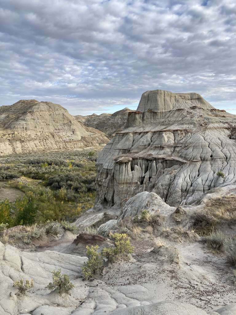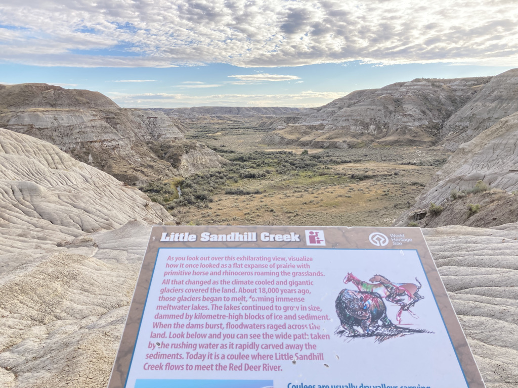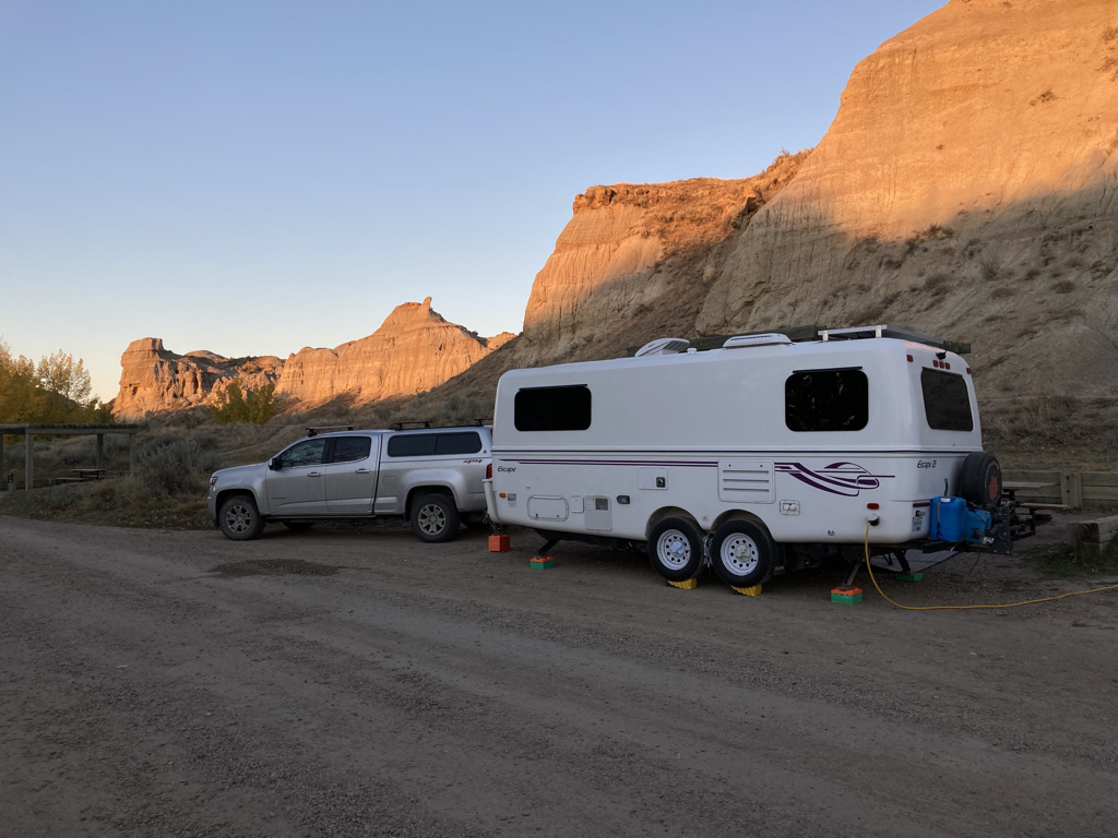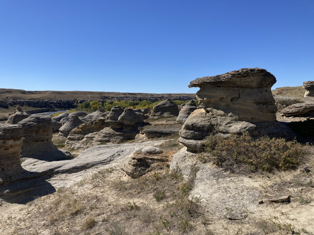 Next stop was Dinosaur Provincial park near Medicine Hat. This park drops down into the valley of the Red Deer River and yet another possible paddle route down the road. While WOSPP was educational with archeologists feeding us with information, DPP was all about palaeontology. The park has interpretive trails with skeletal remains explained. Marnie and Jim joined us for a night hoping the near empty campground would have some space on the weekend. No luck. They left and it filled. Steep towering hoodoos above the campground filled with children running around and being busy little palaeontologists or just daredevils. So fun to see families let their kids be independent and curious!! At points we wished we had little kids to set free.