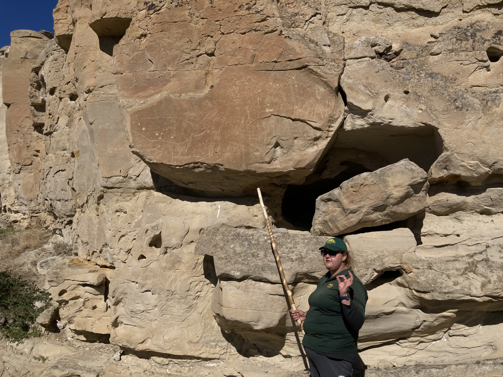 Next stop was Milk River and the Writing on Stone Provincial Park. Again, if you have never been, this is another hidden gem. It is nestled below the wide open and very flat prairie among the hoodoos that line the river. Ten kilometres south of the Alberta border rise the Sweetgrass Mountains, old volcanos that failed to erupt but protrude from the flat arid grassland.