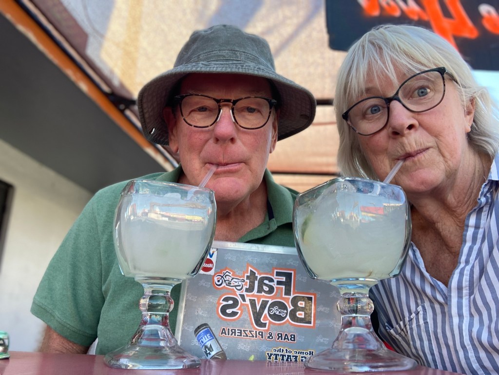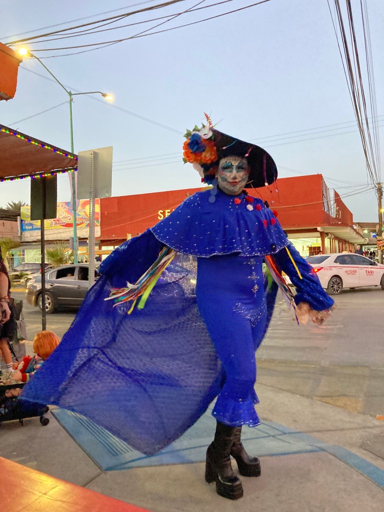 We found out the Halloween parade route passed by a burger restaurant that seemed to be a local gringo haunt. So, we plunked ourselves down at about 3:30pm and ordered our first Mexican margaritas. $115 pesos or about $9CAD our first sip said, out loud, that a second one would relieve you of your legs! So delicious and no crappy mix. This was all tequila, ice, fresh lime and either triple sec or syrup to sweeten slightly. The glasses were too big to lift so we sipped through the straw.