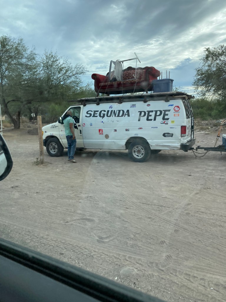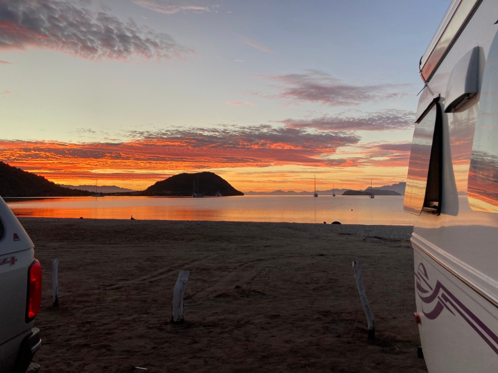 We rolled down to sealevel just north of Santa Rosalia with the view and smell of a massive smoldering garbage dump. High winds blow the garbage to the shoreline and it’s a very big disheartening mess. We are slowly becoming more accustomed to the roadside garbage strewn along our route. It’s prevalence (broken glass, plastic bottles, tires) throughout our trip through these deserts unfortunately or fortunately depending on your POV, makes the ground sparkle. The arrival on the outskirts of Santa Rosalia brought these sightings to a new level of ubiquitousness. We continued along the coastal highway past the copper mine that bore resemblance to an open wound, (ugh!), to a gas station beside an enormous dilapidated and defunct foundry. Googled it – you can go inside as a tourist attraction but watch out for homeless and dangerous rusted out passages… Google also brought me to a blog that talked about child and nearly slave labour in the Santa Rosalia squid factories. I didnt fact check it but the vibe was there for sure… Our first impressions of tropical Baja California Sur were being surpassed by human destruction, subjugation of vulnerable workers, and waste. As we continued to the south end of town, the vibe was much less wasteland. We got out of there! NEVER TRUST A FIRST IMPRESSION!! We later spoke with some sailors out of Victoria, BC, that said “stop on your way back!! The Eiffel Church and old downtown are fantastic.” So, we will report back on that on our way north!!