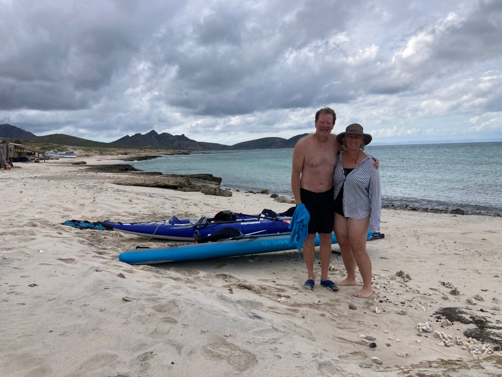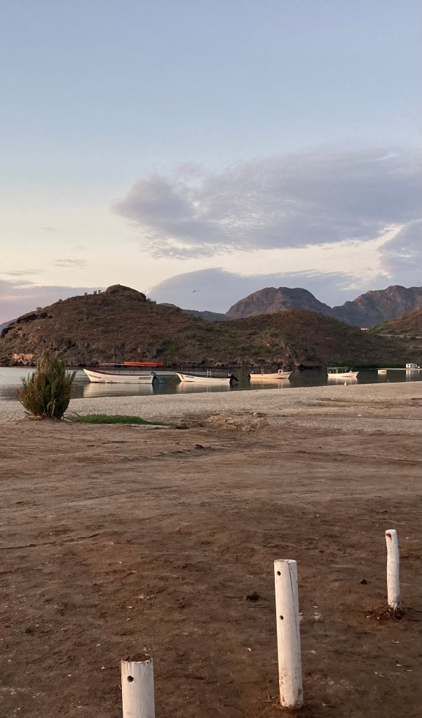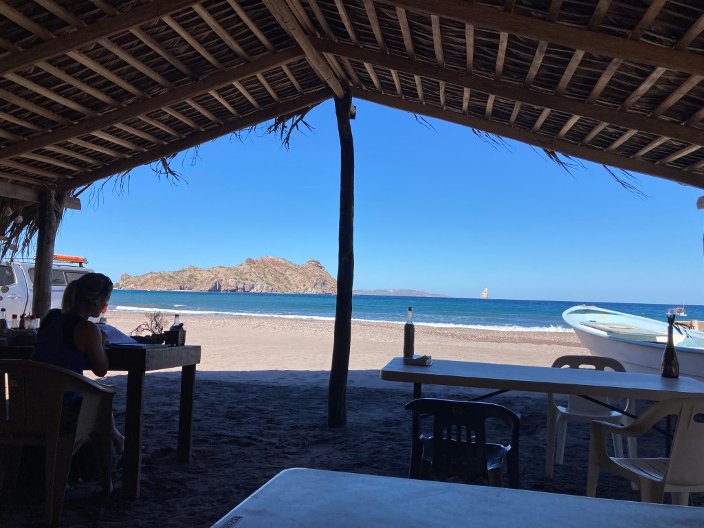 Playa Santispac is a busy little bay where busses bring guests to tour boats, where expats and Mexicans camp in enormous rigs or tents; hawkers renting kayaks, paddleboards, snorkeling gear, selling blankets and hats, plus fishermen selling fresh dorado, halibut, prawns, and scallops. It is busy! There are two restaurants, one with wifi. One restaurant is popular and the other has a less than positive reputation. We went for a beer at the busy one and watched one of the staffers jump in a car and race down the beach to get bottled water, ice and beer. So obviously they have a good relationship. Probably same owner!!