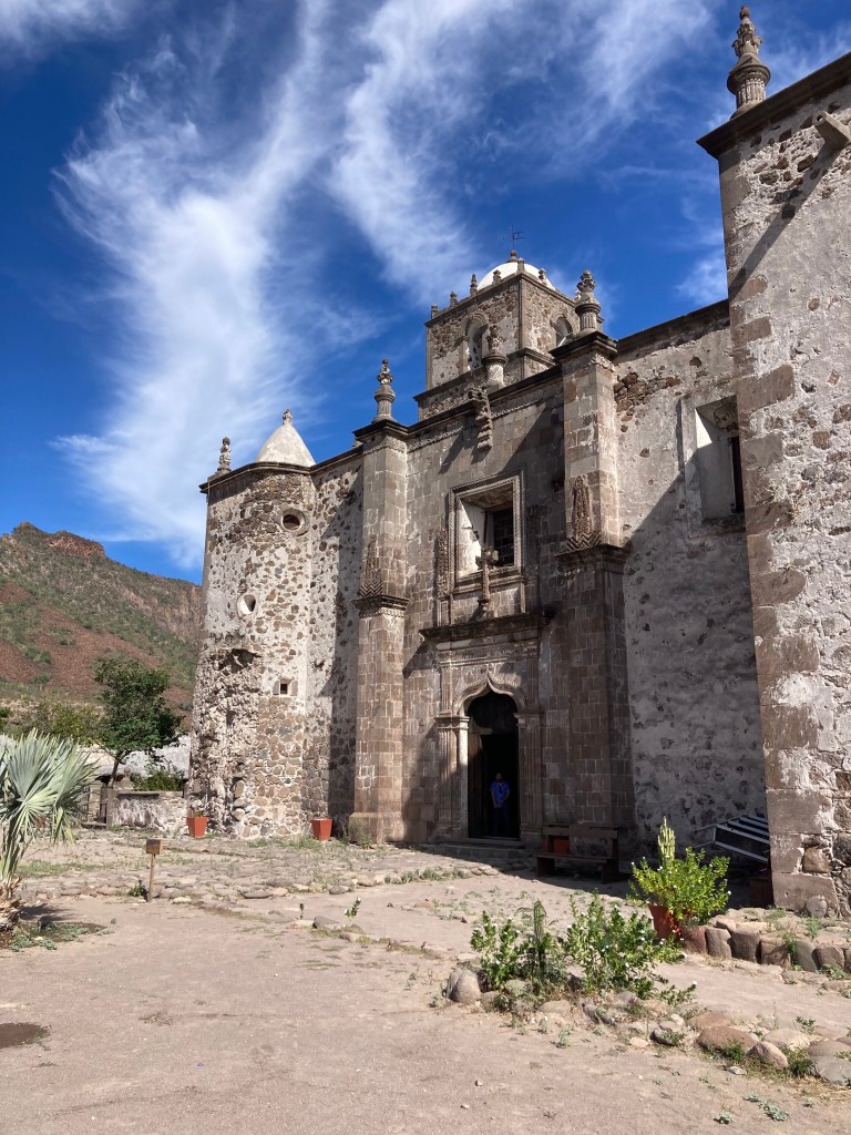 First stop over fully paved road was to the San Javier mission, about 40 kilometers into the mountains. This destination had running water over the road to pass through and a number of palm oases enroute. As with most of the missions along the Baja California El Camino Real, we found out that the Jesuits built them starting in the late 1600s, the Franciscans booted them, then the Dominicans moved in and continued the pilgrimage until Mexico was liberated from Spain. This is a very simplified historical synopsis that was presented in the museum in the San Javier church. The grounds close to the mission offered further evidence of early European influence with a majestically gnarled 300-year-old olive tree.