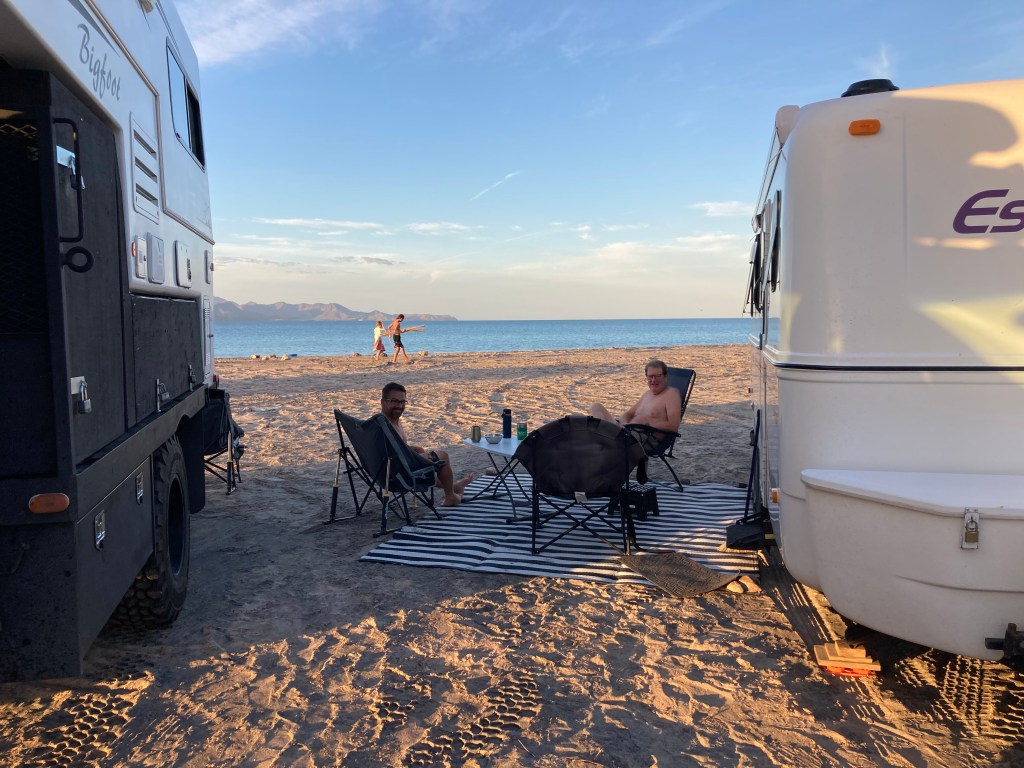 After four nights in Loreto, clean laundry, provisioned and water tanks full, we were headed south again. Dave, who we missed in Mulegé, was camped on the point beyond La Paz. We had a stopover at an organized RV spot at Palapa 206 along the highway in Ciudad Constitucion where we didn’t even unhook. The proprietor there was an expat Brit named Mike. He and his son had just completed the Baja 1000 in a Baja Bug. He regaled us on the British military Gurkha Reserve, over the centuries, soccer, and the merits of choosing Baja for relocation. Very entertaining pre-setup chat before we even parked in our designated campsite. We eventually parked, set up, slept after dinner a’ la trailer-side and never saw him again. We might just drop in on Mike and his Palapa 206 on our return north! No pics of his campground…or him…