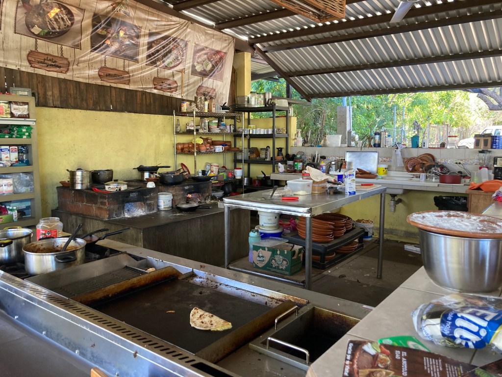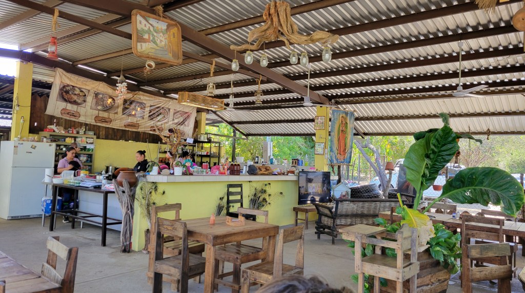 This impressive structure encompassed a large dining area, a cooking area, preparation/ service area, and commissary partially visible from our seats. The gardens had roses, numerous flowering Bougainvillea, and many cacti and Agave. They had a herd of goats, an ostrich, donkeys, cattle sang with the roosters and chickens. Queso from the goats was on the menu in the rellenos. Wood fired comals (a grill) kept pots hot and tortillas grilled. Five women of differing ages provided our comida. Fresh strawberry juice, orange juice from the nearby trees, and honest local fare done well. Surprising, considering we were out in the middle of nowhere halfway to the imposing mountains that provide the back drop to the desert sands on the East Cape. No Cervesas on the sabbath but the fruit juices served were delicious and satisfying in the midday heat. We ordered two different platters to share taking half home for later. Lunch was enough to take us through to breakfast the next day!!