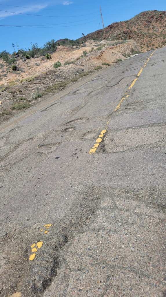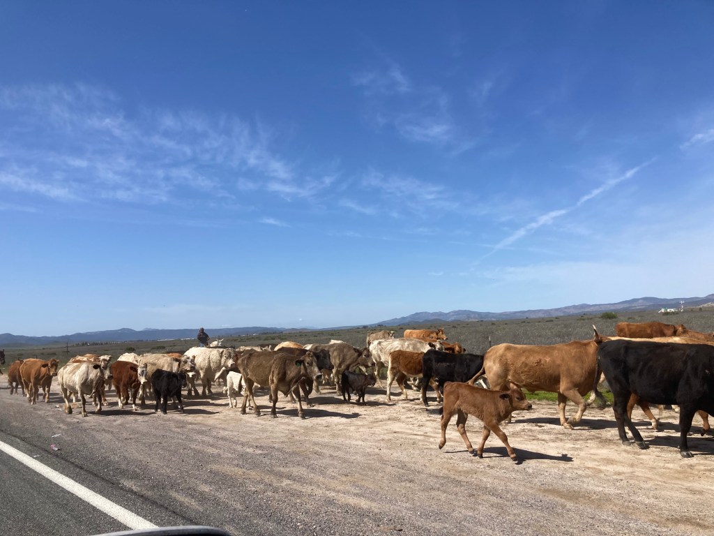 A few days later we had crossed the middle of Baja and were headed to the Valle de Guadelupe, Mexico’s wine valley. We decided to take highway 5 up the east side as we heard the road was better than the west side, less traffic, and we knew lovely free places to stay from our trip south. We stayed one night at our first Baja beach, La Poma at Punta Bufeo. Quiet save for the waves lapping below our parking spot. Next morning we hit the road. North of San Felipe is a secondary highway (#3) that goes up and over the mountains to the large city of Ensenada. This route has ranching, cattle, goats, desert, huge rock formations, and potholes. Lots of potholes. Recent rains hurt the roads and greened the pastures.