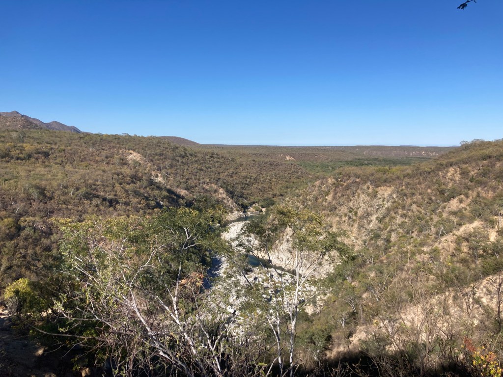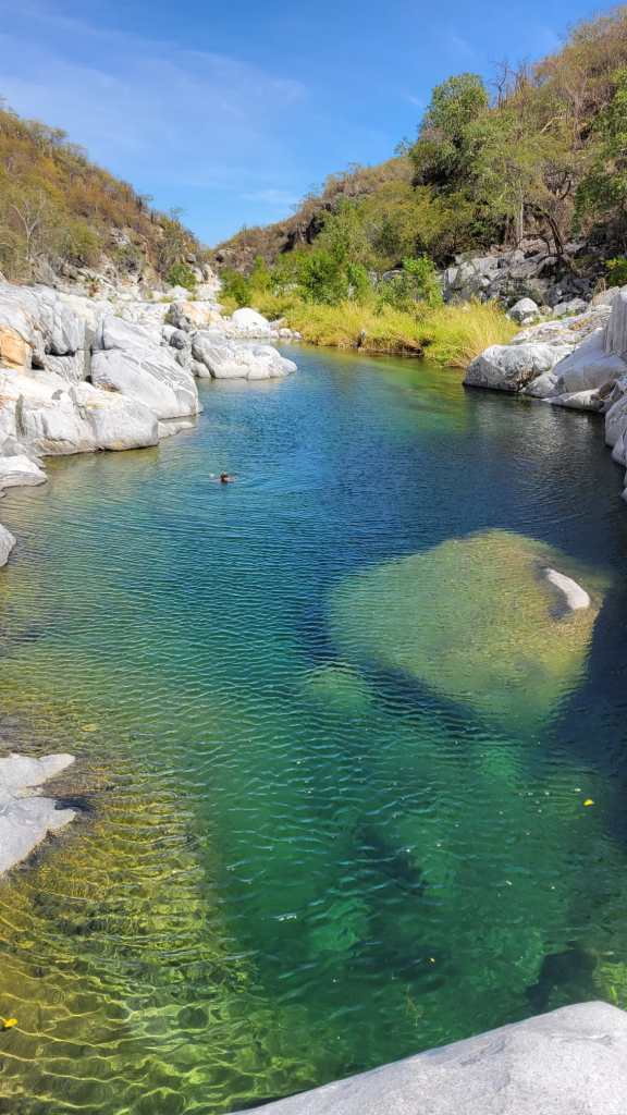 After Todos Santos we met up with our pals at a small hamlet called El Chorro in the mountains behind Santiago. Mostly gringos live in this little area near the river with hot water bleeding out of the rocks and are captured in rudimentary pools to relax in.  A campground was near the river so we found a spot and wondered when we would see an official to pay. A few years ago, legend goes that there were a couple of deaths by drowning in the river so the campground was closed until they could or would staff a lifeguard. This wasn’t going to happen, and the road is open so now it is more of a day use area for the locals. It is in the national park so normally 200 pesos per person but since it closed no one collects, so no charge. We camped there for five magnificent nights.