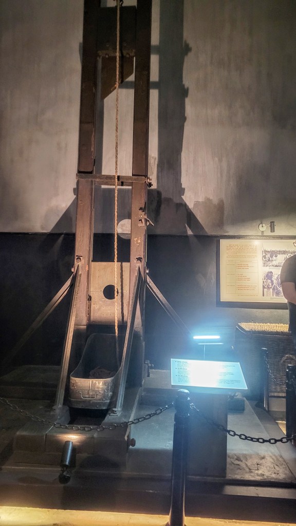 Figuring out daily things to do and see always reverted to the resilience of the Vietnamese people. Our first museum was Maison Centrale. The French built this tortuous prison and named it to sound like a warm home. During the American War it was renamed the Hanoi Hilton by its prisoners. The guillotine is still in place and the stories of the horrors of its inhabitants are remembered and displayed. A “must visit” that was very sobering. The narrative within the museum whitewashes over the torture inflicted on prisoners during the American War and portrays the Vietnamese as kinder than the French colonialist occupiers that preceded that conflict. Statements by US P.O.W.’s such as Sen. John McCain and others are framed in a tone of reconciliation and forgiveness but the menacing atmosphere of past brutality and human atrocities by all previous prison personnel (French occupiers in the early 1890’s and Vietnamese afterwards) hangs in the air like an evil, cold, damp shroud impossible to whitewash away.