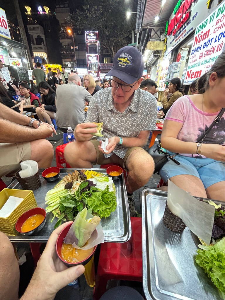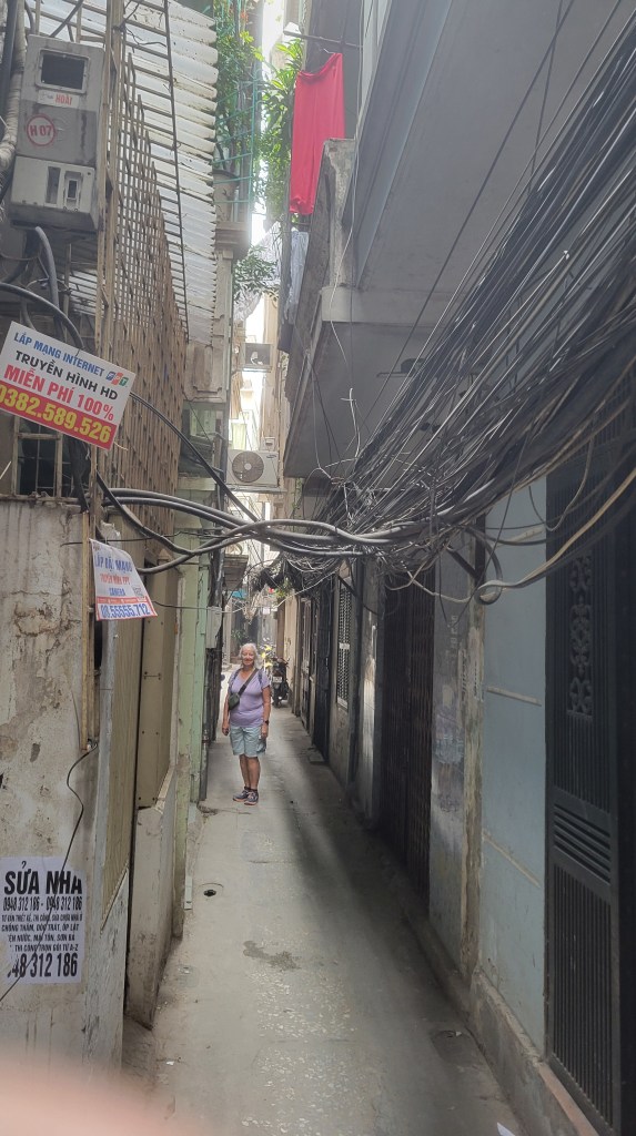 We did sign up for a restaurant tour and visit to Train Street. There is one train line, the North-South train line also known as the Reunification Line, that goes from Ho Chi Min City (formerly Saigon) to Hanoi. Just a kilometer or so from the Hanoi train station the line passes between houses and restaurants with inches to spare. When tourism opened up, Train Street became an attraction. And it did not disappoint. Like Beer Street it is very busy. We found it fun sipping a very cold beer, on a tiny plastic stool, at the restaurant that sprawled across the tracks.