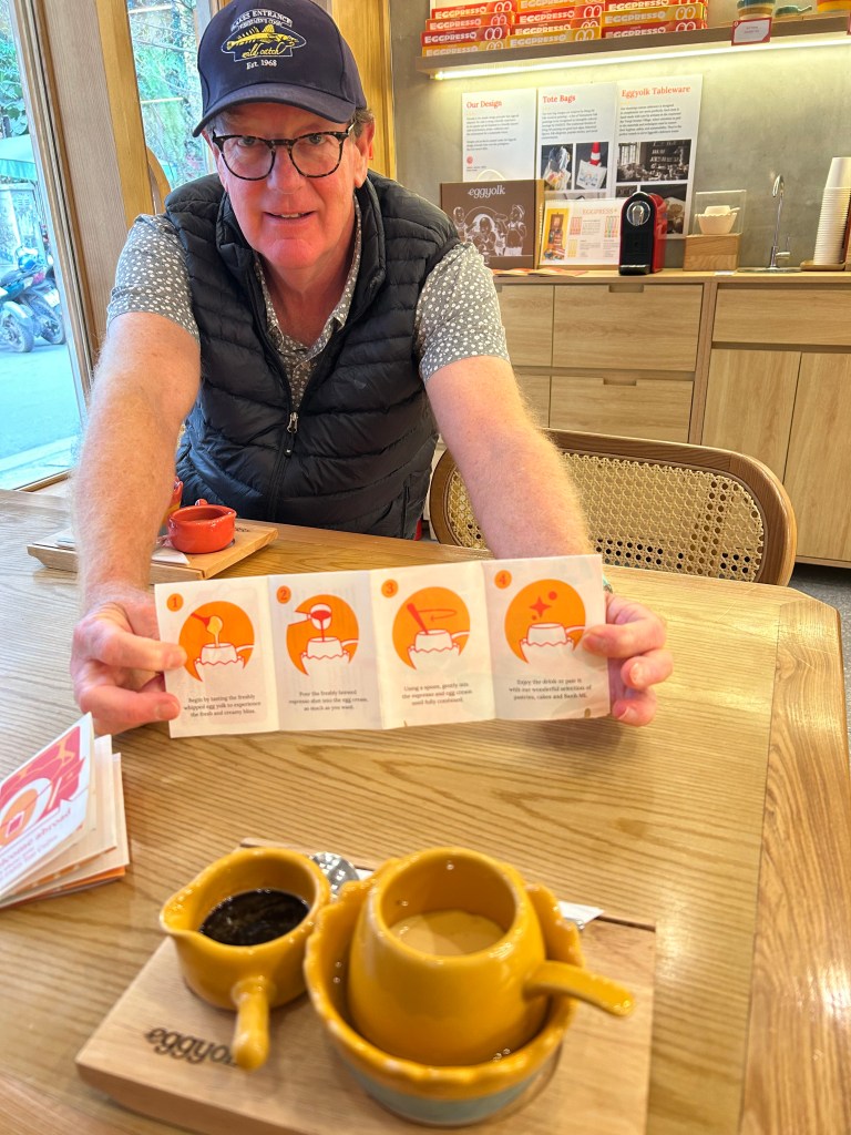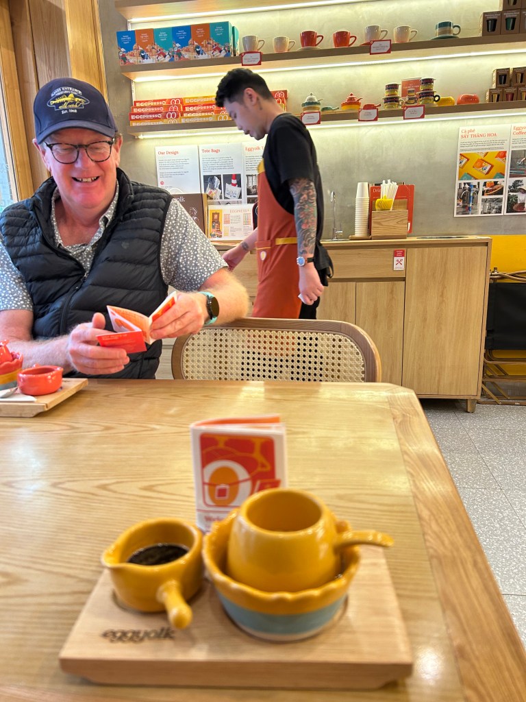 Arriving early in the day we were hungry and I convinced Albert to have a Bahn Mi at a 4 table restaurant next to the hotel. He was a bit guarded as the Bahn Mi experience we had in Hoi An had begun all our gastro-troubles. But it was good. We talked with the proprietor who asked if we were going to go to a number of places. The Hanoi Hilton? The Womens Museum? Train Street? And the list went on. Yes! As we continued along we saw an egg coffee shop and decided to partake. Egg yolks are whisked with sugar until creamy like sabayon, then hot espresso is poured in and it is combined and consumed. Very rich. Very delicious.