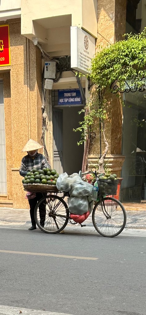 By the time we left Vietnam we were very skilled at crossing the roads. Often there might be a traffic light but more often there was not. With 8 million Hanoians and almost 7 million motorscooters, 1 million cars, plus busses, rikshaws, tuk tuks, cyclists and pedestrians it is a feat to navigate. One of our tourguides said we should “always look at the oncoming traffic, put your hand up and walk without pausing. Never walk in front of a bus as they are on a schedule and will kill you.” But I couldn’t look, we would find an opening and go. If we didn’t look we lived. It was like, if you look at someone walking towards you, you walk into them. By looking away you avoid them. At least that worked for us.