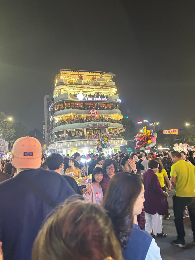 We walked to Hoan Keim lake about 3 blocks from our relatively quiet street and pushed through the hoards of tourists taking selfies in front of this multi story shopping mall. We learned it was going to be destroyed for a bigger and better one so hence the photos. So we took one too. This one was a better shot on another evening.
