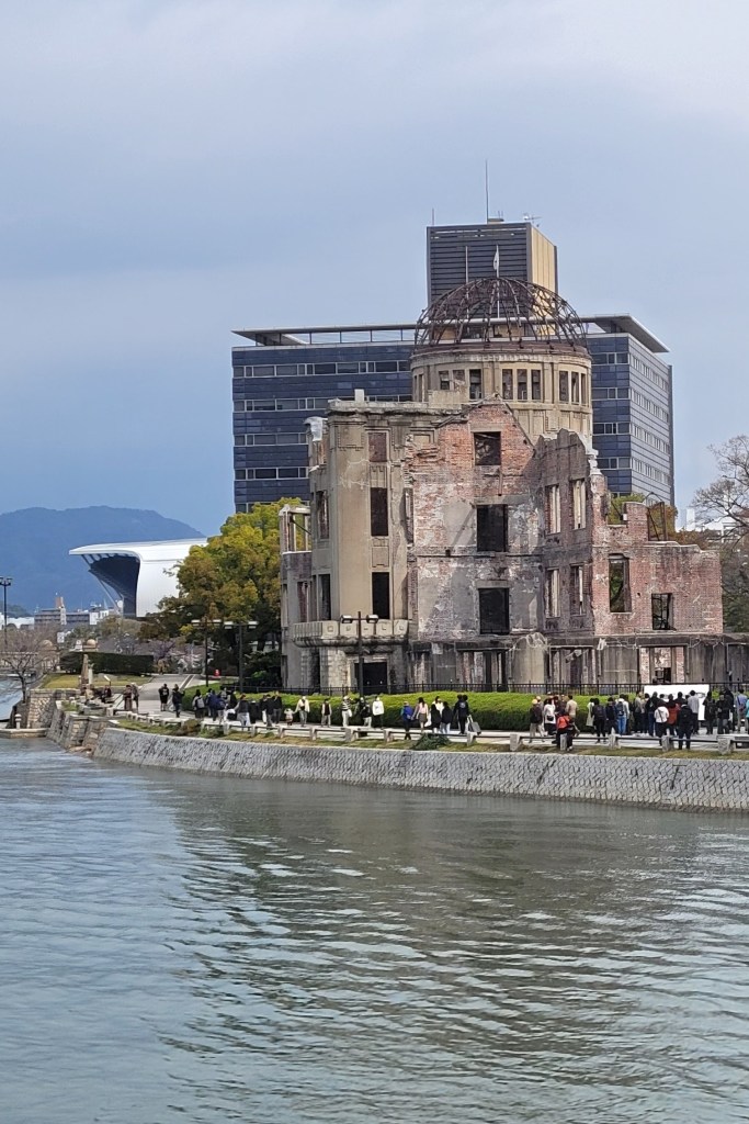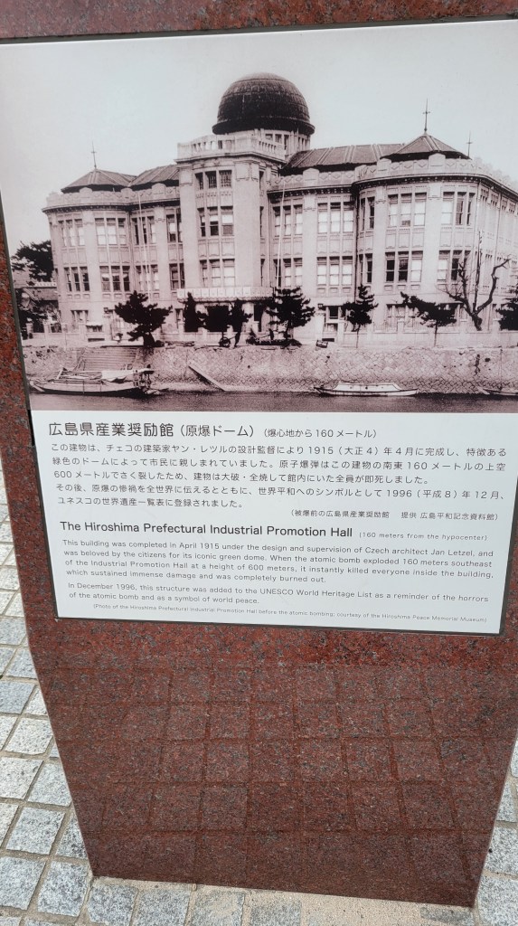 As we walked to the Hiroshima National Peace Memorial Park we saw a small unassuming cairn with a plaque before we crossed over the Motoyasu River. Quite by chance, we were standing 600 feet below the hypocenter where the first nuclear bomb had exploded evaporating everything all around us. NOT WHIMSICAL AT ALL!