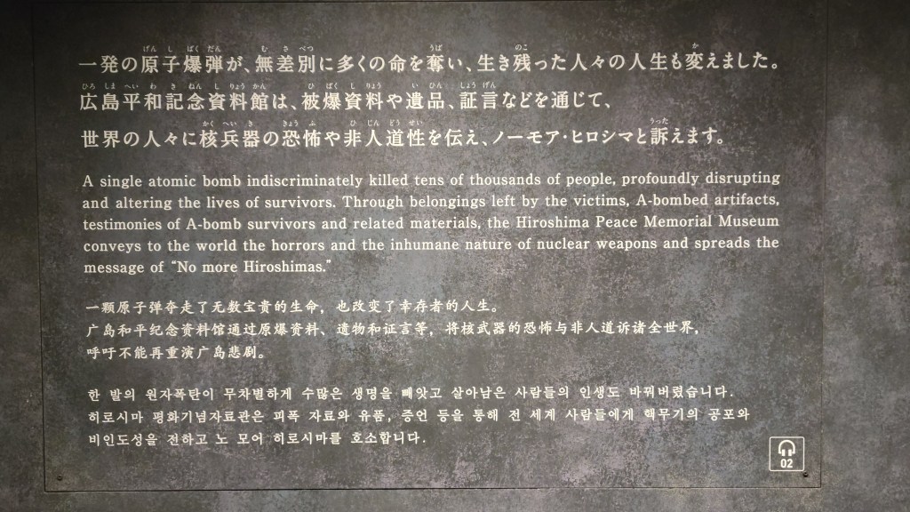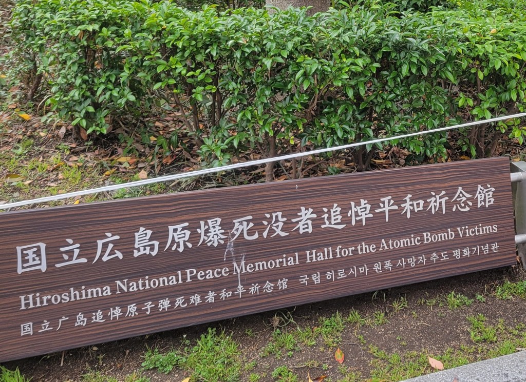 Looking up we saw a beautiful public space, eerily quiet, with sculptures and artforms commemorating the people and children, lost or maimed, surviving or sick, and a giant message of hope for a future world without nuclear war.
