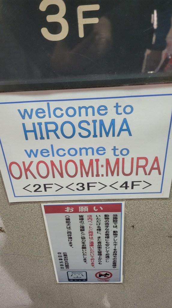 Hiroshima’s “dish” is Okonomiyaki. It is made on a bar-side griddle that is warm but not too hot in front of the guests who order it. This 7 story building had 3 designated floors of it for the public.