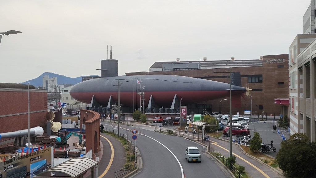 Looking at the map and how the proverbial crow flies Kure was a coastal port town that was part way to that destination of Marugame so it fit the bill. Kure was more of a working navy and port town It had a naval museum with a big beached submarine which was quite interesting.