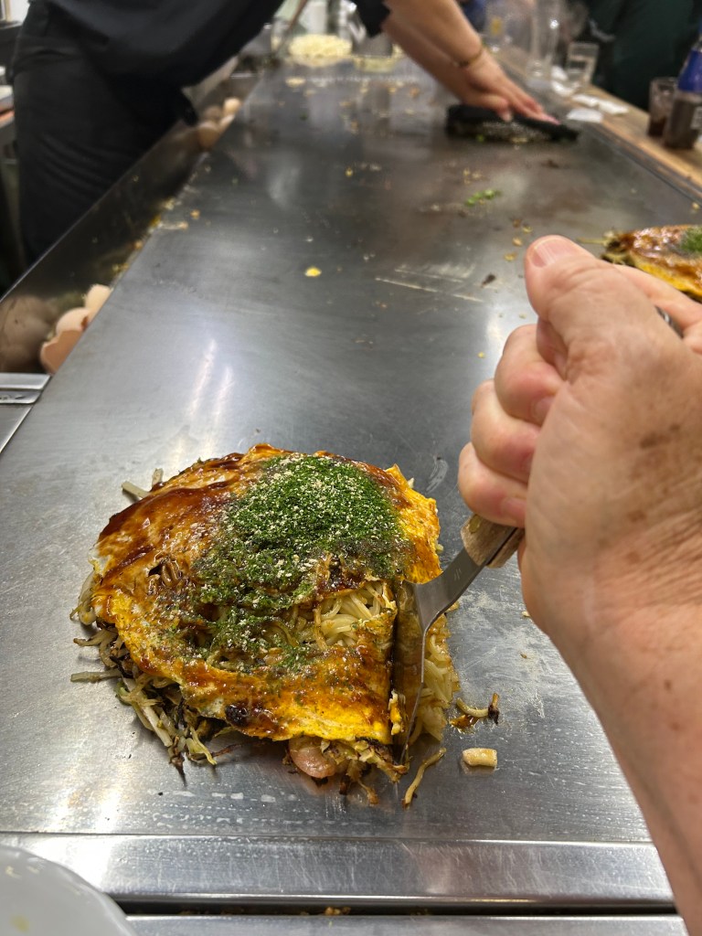 A thin pancake is laid down then topped with finely shredded cabbage, seaweed, spices, dry shrimp, bacon, noodles, scallions, sesame seeds, then flipped and topped with a fried egg, seafood of choice or cheese, pickled ginger, daikon and a sauce similar to Tonkatsu. Kind of an everything and the kitchen sink on a grill!  It is served with an offset metal spatula that is used as a knife to cut bitesize morsels and eaten with chopsticks. Of course.