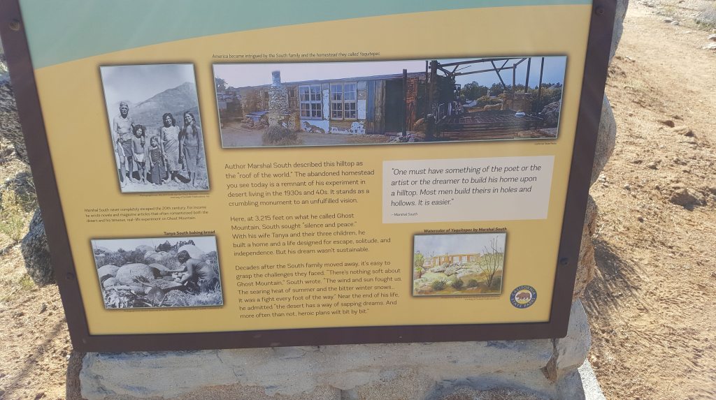 On one of many hikes we checked out the Marshal South Experiment homestead on the top of Ghost Mountain. In the early 1900’s an interesting and resourceful fellow by the name of Marshal South and his resilient wife Tanya, decided to get back to the land in the middle of a dry desert on top of this mountain. They raised 3 children, then were given the land before they were asked to move off during wartime as the military was using the area to test weapons. Living 500 ft up a mountain, miles from a town in a sweltering desert has some challenges but set that challenge in the 1930’s and the bar is raised significantly. The South family would have had to carry 120 lb of water per person for the cistern, food staples, building materials (like cement and furnishings) up to the homestead every few days during the hot dry season until they had a functioning livable space. This infrastructure would have had to be carried up the steep switch backing trail from the valley floor. No big deal but the trail was over a mile up the hill without shade protection. Yikes!! He wrote articles about living in the desert that were published as an income for them. The lifestyle became too much for all of them and they moved back to the town of Julian. The kids were bullied by their classmates for their long hair, “Tarzan” clothes and strange upbringing. Tanya eventually filed for divorce after rumours of Marshal’s affair with the town librarian became known. He died a pauper a few years later but she lived until a few months short of 100.