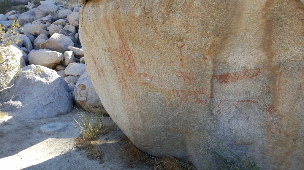 Remnants of the homestead were still there, and a testament to a get-back-to-nature ideal that still has appeal today. The desert was slowly reclaiming this attempt. Not far from this hike, and still adjoining the Blair Valley was the Pictograph trail where ancient rock paintings were still visible from the first nations who lived and traveled in the area hundreds of years ago. Further along this trail were remnants of a village where we found numerous signs of Morteros (ancient mortar/pestles) in the giant granite rocks used to grind nuts and seeds into flour. The end of the valley wash was highlighted by a large, scenic rock overlook in the mountains that offered panoramic views through Smugglers Canyon to the Vallecito Valley where the Old Stagecoach and Butterfield Overland Mail routes once serviced the area.