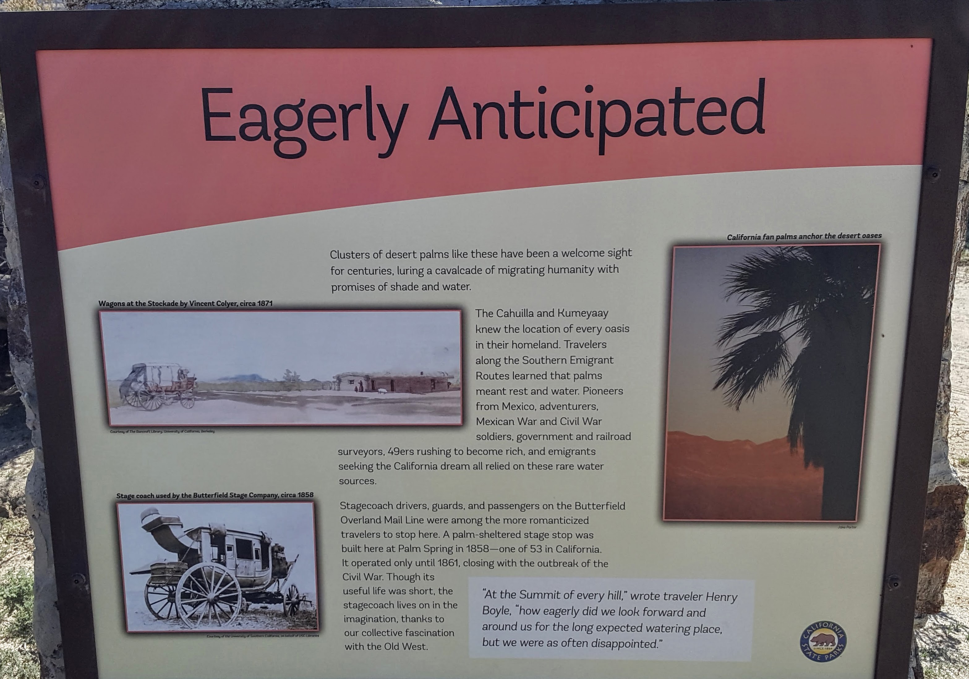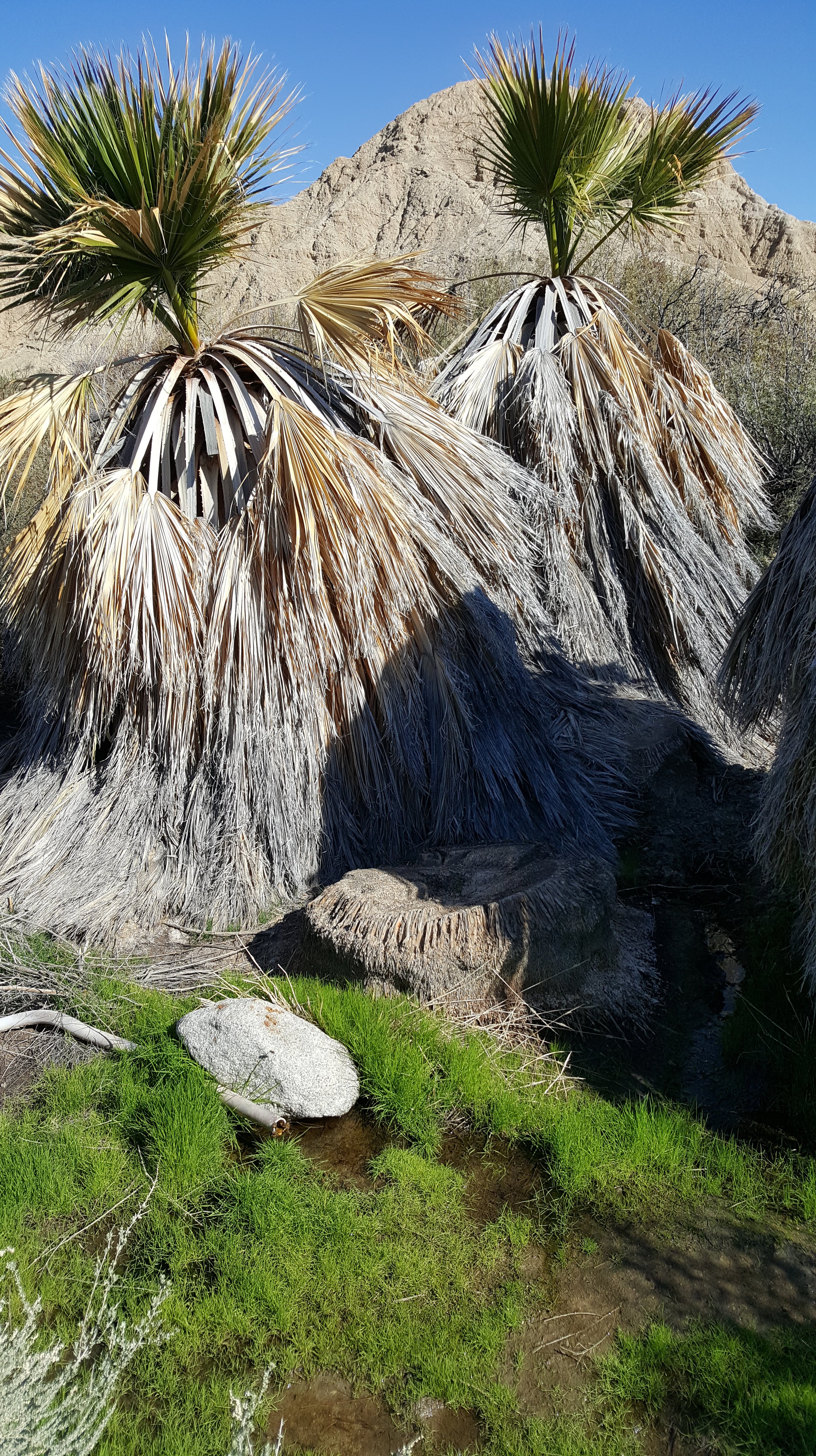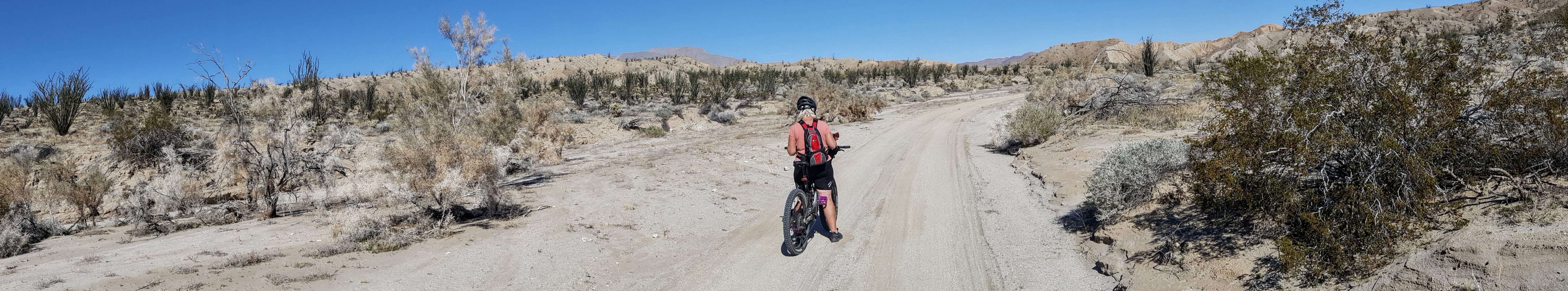 Another great discovery was Agua Caliente. This San Diego County Regional Park was built around a natural upwelling of hot springs. We decided to try out the hot pools and cool off in the outdoor plunge pool. For three dollars each we had relaxing, swims and showers. This park had camping as well so as a treat after weeks of boondocking we stayed two nights with power and water hookups and endless soaks in the pools(ahhh luxury!). Agua Caliente, translated to Water Hot, was an oasis that had a chorus of frogs. Lots of frogs. It was so strange listening to them all night in a veritable desert. We went for a 40 Km bike ride along the old stagecoach route and up an arroyo (wash) to the Vallecito Badlands. When we emerged from our ride, we stopped to take a photo and along came a lovely gentleman, Frank, on his e-bike. He had just ridden up one wash across two others and down another to make a 44 Km loop. He was excited because he had given up mountain biking as he grew older as he didn’t have the strength and endurance anymore. Then he added a battery system to his fat tire bike, and he was able to ride the washes and hills again. We pegged him in his early 70s. As he peddled away and bade us farewell, he said “Have a great trip, by the way, I’m 85!!!” A hero with many tales, we are quite sure.
