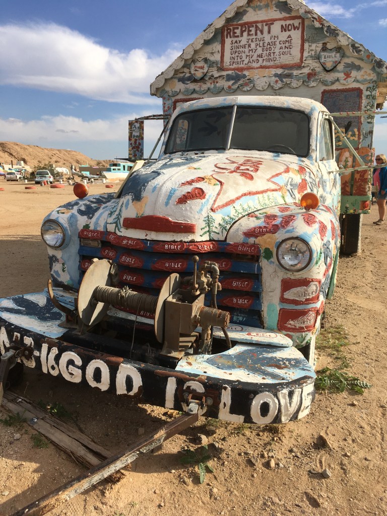 While we were camped at Blair Valley, we reconnected with a friend from my (Deb’s) childhood. Her parents were good friends with my parents. Susan, their youngest, was closest in age to Marnie and I. Susan and her husband John, retired from the Fort Mac oil patch a few years ago and became full time RVers. The last few years they have wintered on the Colorado River in Parker, California. They brought their toy hauler trailer from Parker to Blair Valley and spent a few nights camped with us. During the days we hiked, went on a driving tour of Borrego Springs, the Salton Sea and the sketchy, weird Slab City.