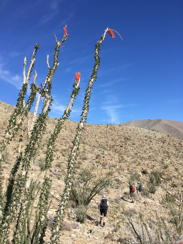 There were many places outside of the organized campgrounds that we could park the trailer within ABDSP with no charge to stay. These locations had maximum 30-day duration rules. Our first boon-docking week was just off the Borrego/Salton Sea Highway, east of the town of Borrego Springs, at a site known as Arroyo Salada. We found a quiet and private site at the top of a “wash” with a public pit toilet nearby and a few neighboring campers behind other hills. A “wash” is a dry creek, stream bed or gulch that temporarily or seasonally fills and flows after sufficient rain. It was quiet and peaceful except for the infrequent car through the night and distant coyotes yipping and yowling. There were a number of hiking and biking opportunities from this site as well, so we did!! We met a couple, Ian and Valerie, from Vancouver, BC, that were camped in one of the neighbouring campsites. They were avid hikers returning yearly for the past 27 years. They invited us to join them for a 10-mile trek up into the surrounding mountains that began and ended a circuit located quite close to our camp. It was a spectacular beginner/ intermediate hike and we felt quite satisfied with our efforts. The scenery and overall environment seem bleak, moon-like and dead at first glance but by immersing yourself in it you did gain a deeper appreciation for the delicate balance that exists between intolerable summer heat and adaptations of the surprisingly abundant flora and fauna.