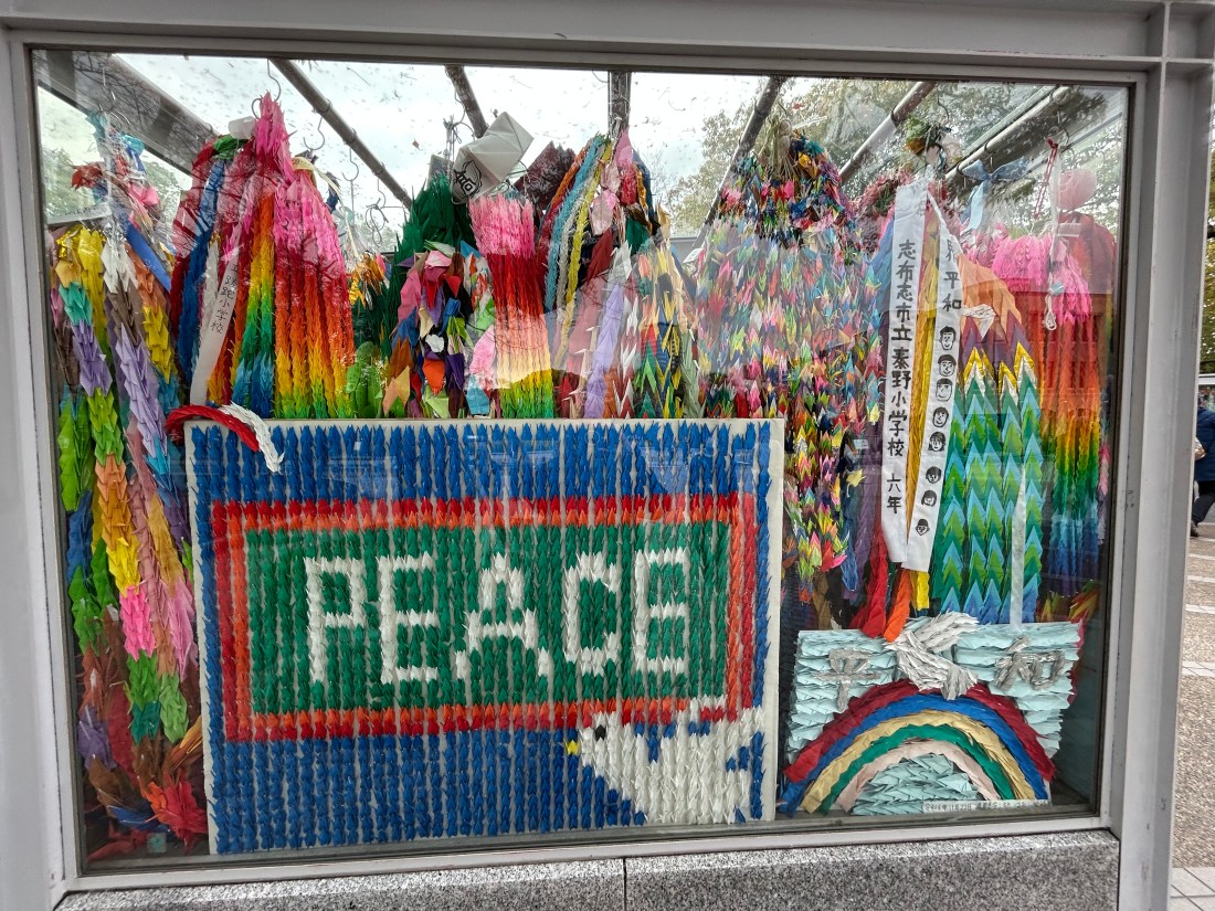 Outside is a childrens memorial with tens of thousands of origami paper cranes attributed to the Japanese belief that the crane is a symbol of long life. After the bomb, many people including many surviving children became sick with leukemia from radioactive Black Rain.