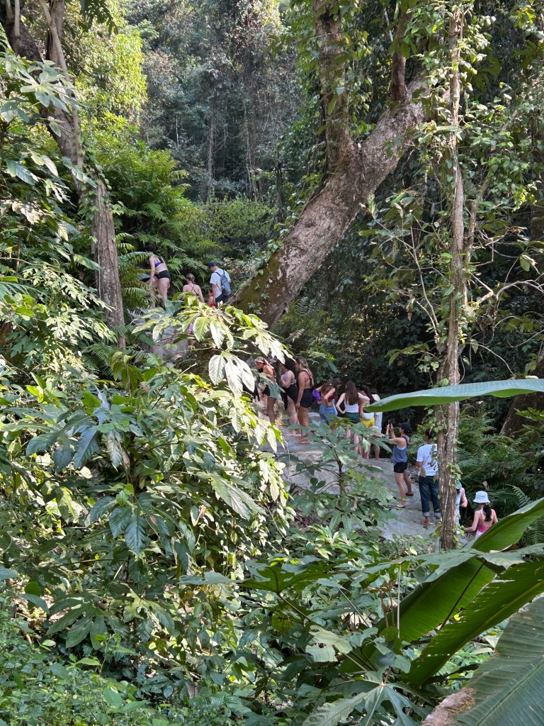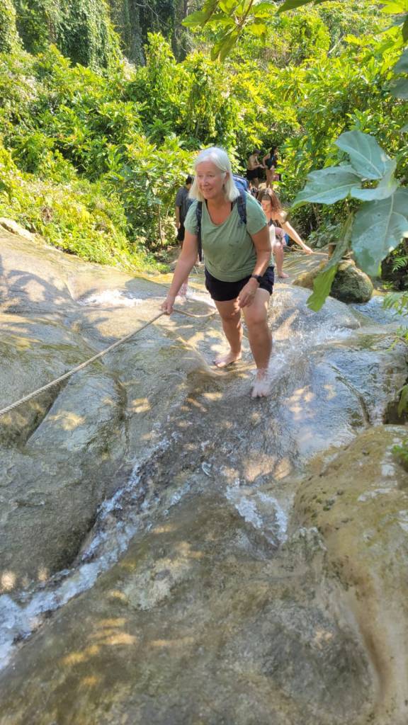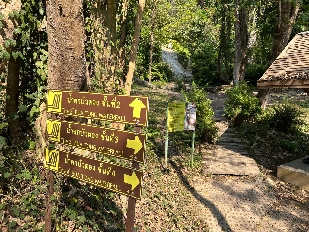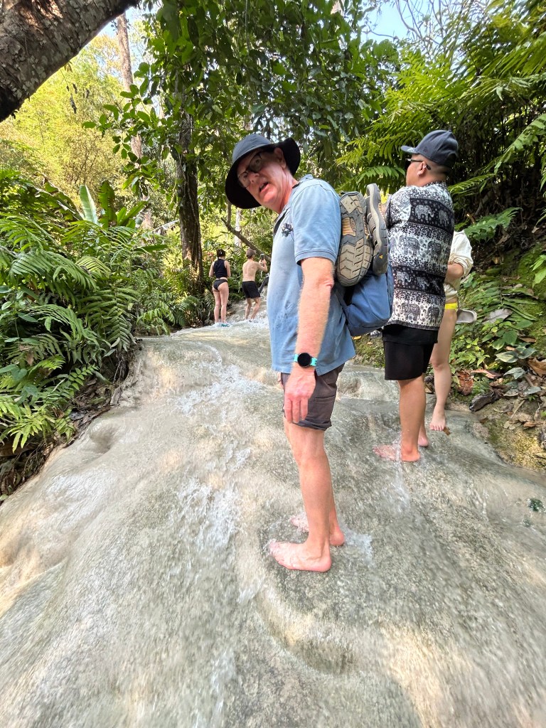 From the Karens, Andy drove us to Chetsi Fountain National Park where the Buatong waterfall has been nicknamed Sticky Falls. This waterfall has a surface of Tufa (calcium carbonate) making it easy to ascend in bare feet from the bottom of the valley. So we and hundreds of others did the same.