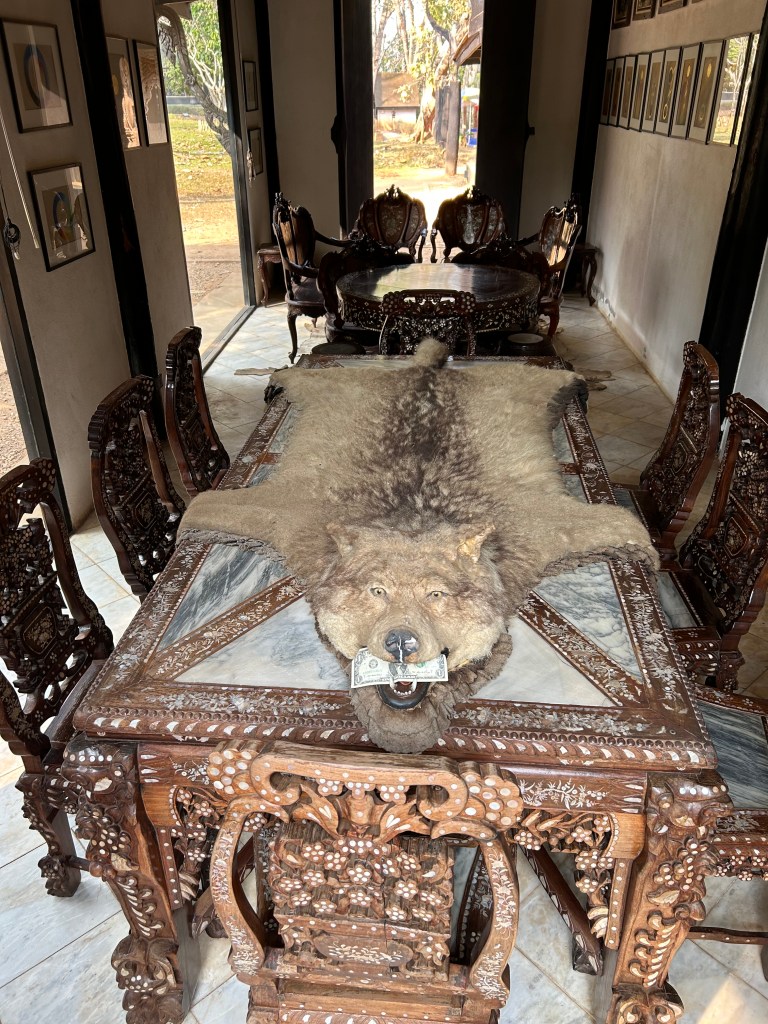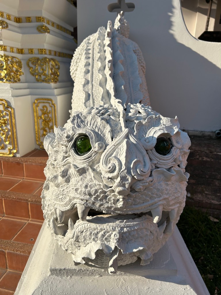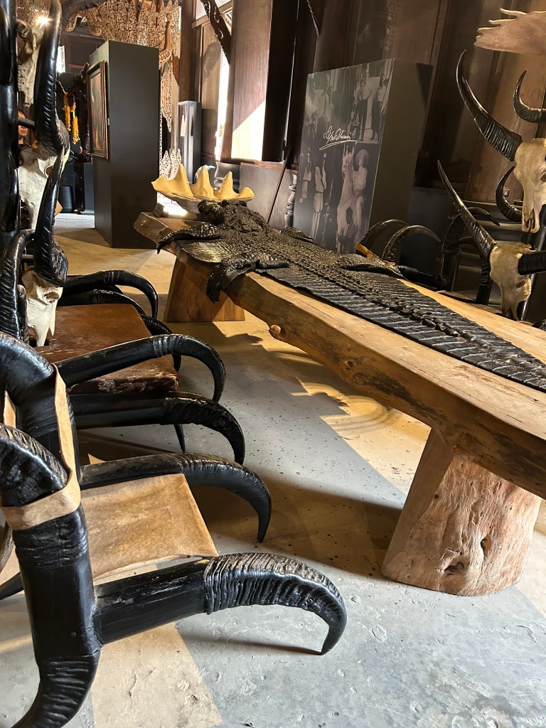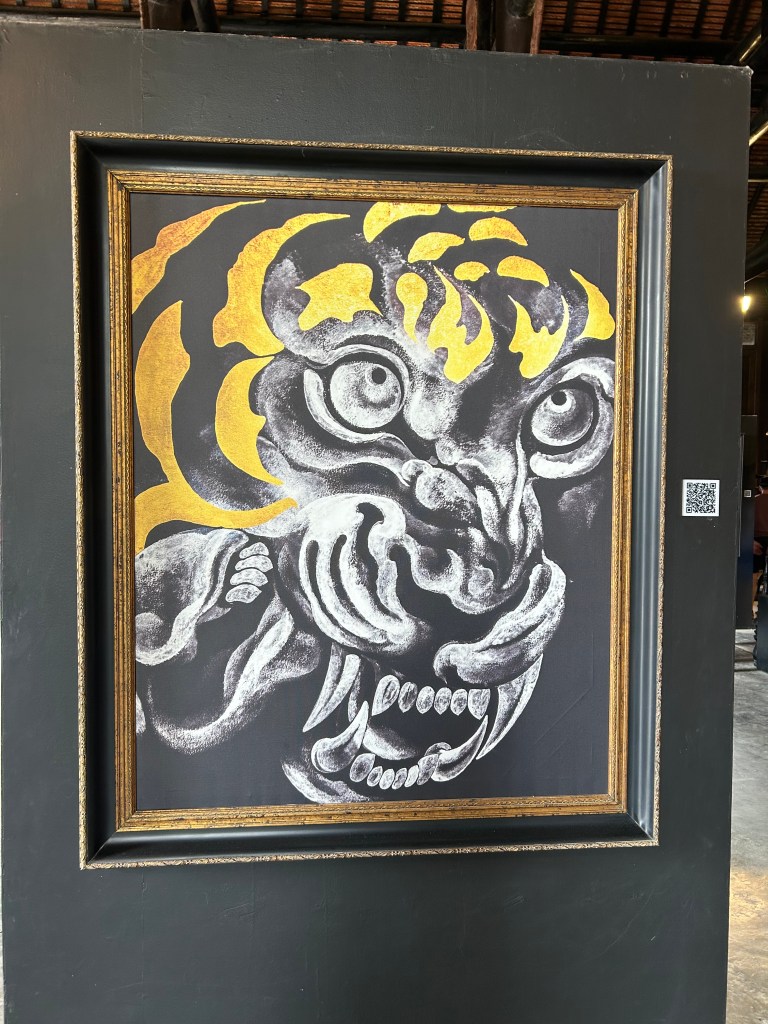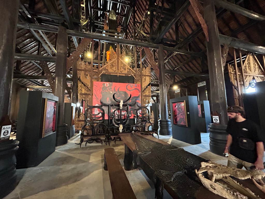 This destination was not really a temple but the residence and property with outbuildings of Thai legendary artist Thawan Duchanee. He has since departed but his son lives on the property and has opened it to the public and tourism. His very bold prints, sculpture work and collection of pelts, skins, tusks, antlers, bones and buildings were awe inspiring. Dark, but interesting. This was a highlight. Not to be taken lightly as art can be very controversial. It struck the chord between light, dark, harmony and disfunction. Easy to think and overthink.