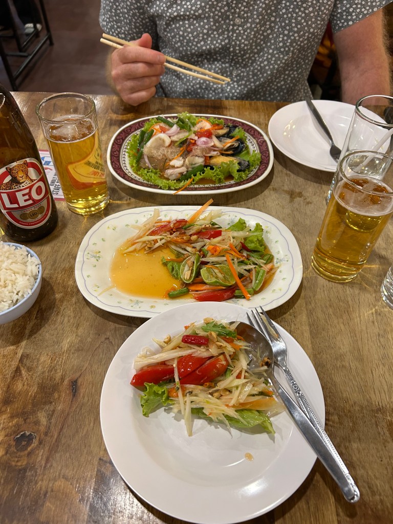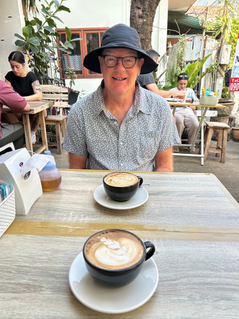 Then we found our favourite Thai restaurant, Lookbau(??). We ordered roast duck with mango, glass noodle salad with seafood, green papaya salad, and some rice. Beer served over ice is a favourite way to have it icy cold. It’s also a good addition to water replenishment. We thought it wouldn’t be good but we were mistaken (NB. add a lime twist to move the bar to max). Deb had a real world update one morning with just how well entrenched her coffee ritual/ habit was (and it didn’t go well) So we always found good coffee!