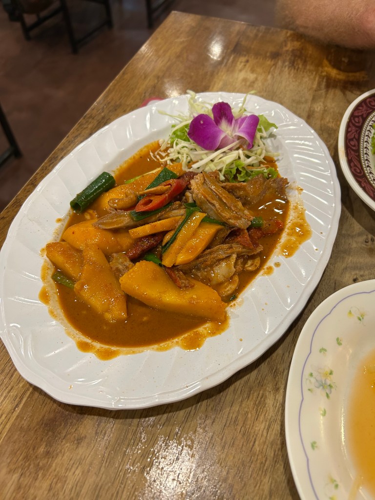 Both salads had the perfect amount of sweet, sour and salt and the glass noodle salad was made by stirring hot freshly cooked noodles into the rest so it was warm and cold at the same time. Our taste buds were going off! The perfectly ripened mangos here make you cry. So, the roasted duck with a bit of its crisp skin tossed in the sauce combined with the sweet and slightly tangy mango chunks left us wishing for more. But we were full.