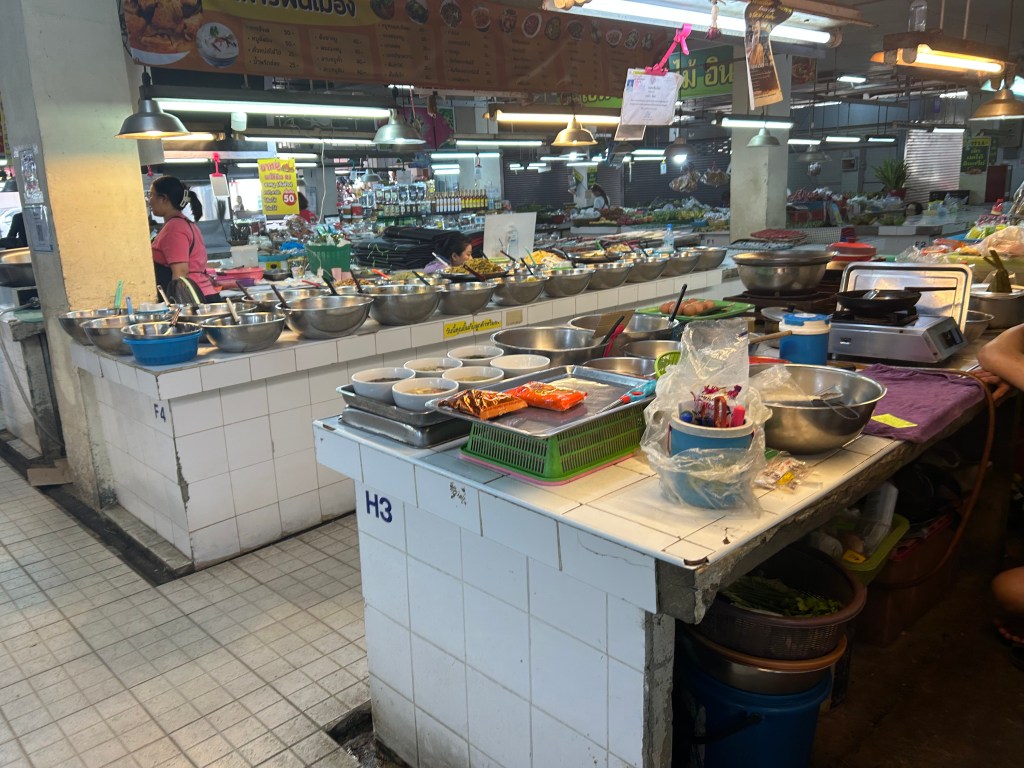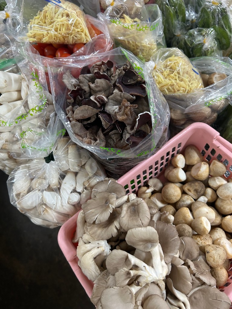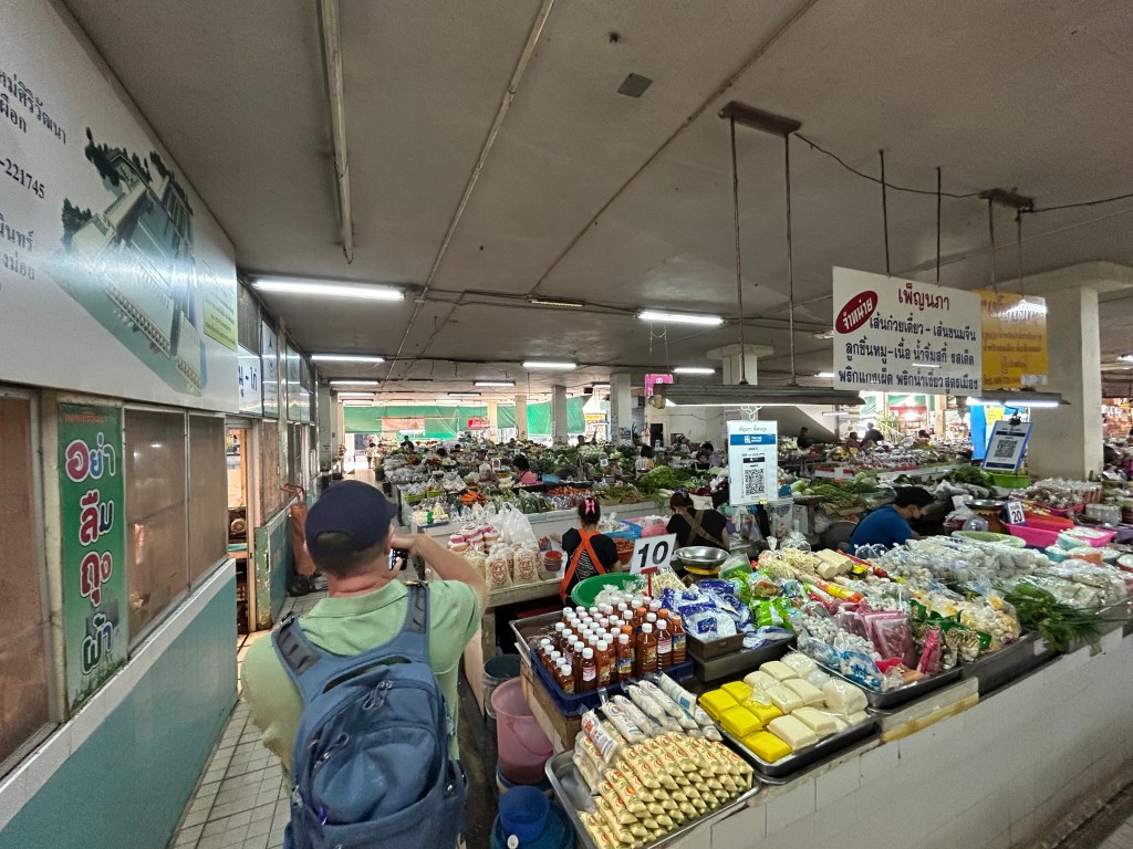 Our first full day in Chiang Mai included a half day cooking class at “Smart Cook Thai Cooking”. We were to be picked up between 1 and 1:30pm. The transport was a little late so within minutes we had texted Ms Aom and she let us know they were on the way. Our ride was a Songthaew, a covered pick up truck with two benches in the back used as shared taxis. The city does not have a transit system but the Songthaews are everywhere boasting 30 baht rides. We jumped in the back where three 20 yr old Canadian women, studying abroad in Singapore, were having a Thailand long weekend. They were going to the same cooking class. First stop was the public market. The cooking school staffer who was in the front of the truck gave us each a menu of dishes we could choose 3 from, to prepare at the class. She invited us to look around the market while collected a few more items. Shopping for only about 10 minutes and we were off again. This market was outside the moat and having had a 10 minute tease, we vowed to come back when we had more time.