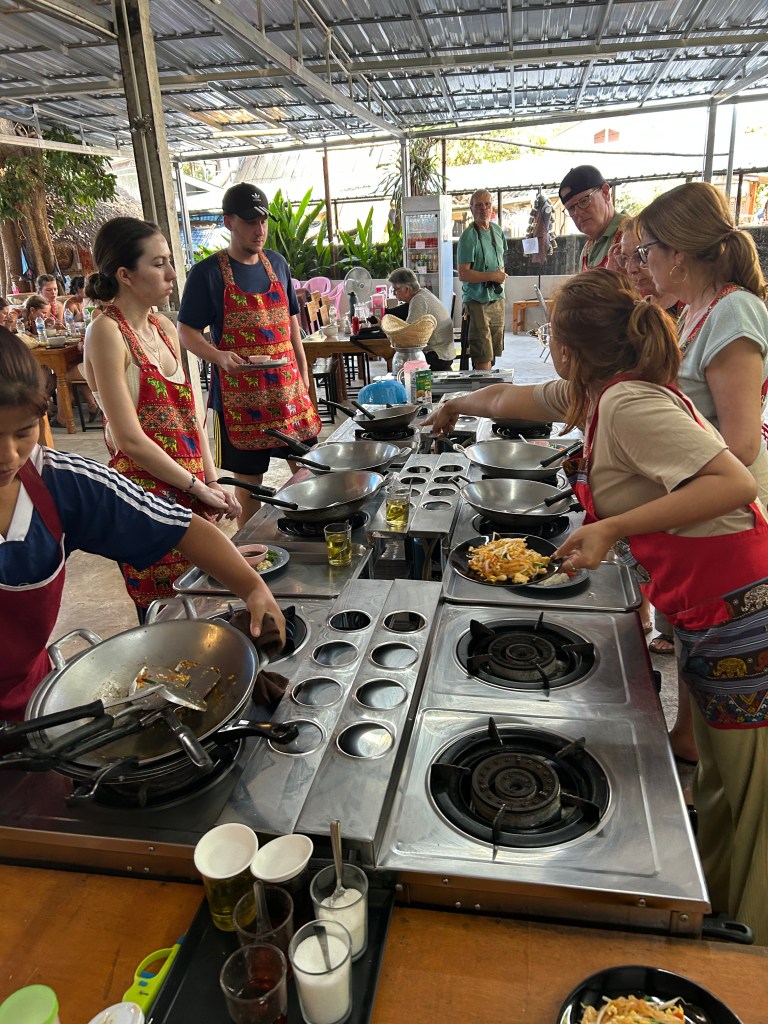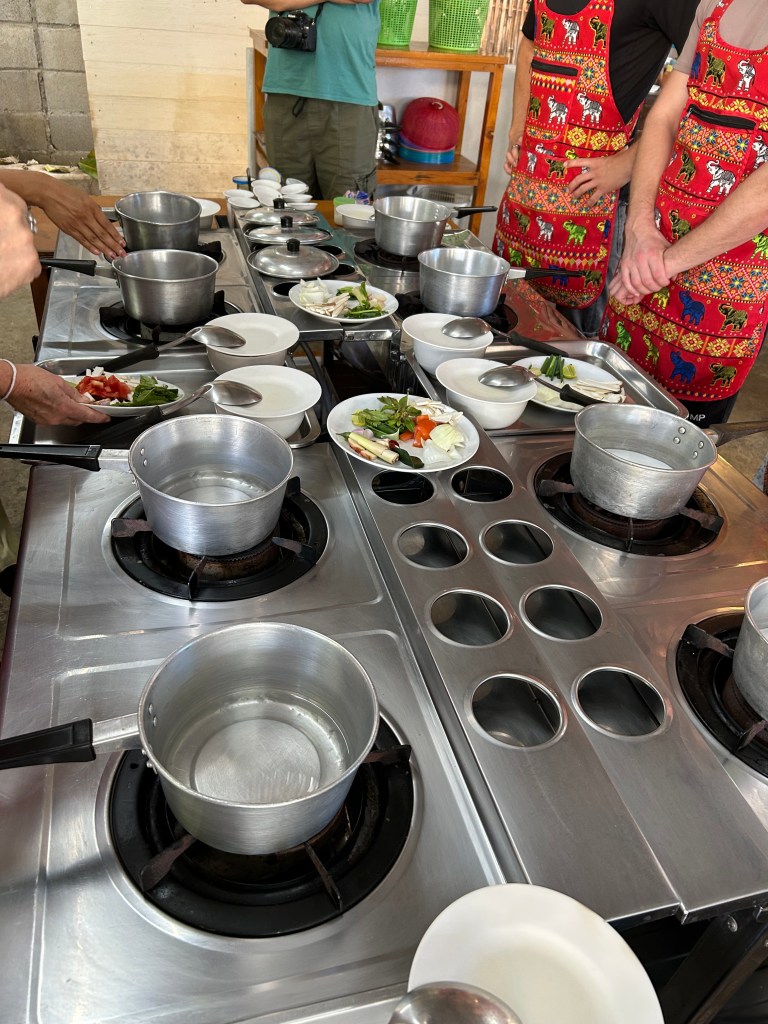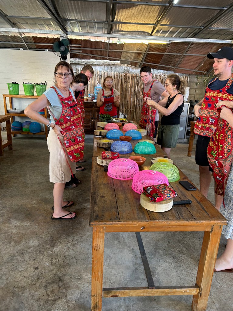 Arriving at the cooking school Albert and I were added to a table of tourists. Two French, three German, one Brazil, two British and us. Our teacher laid down the game and we did as we were told. I chose to make Pad Thai even though I make it regularly at home. I learned that I could make it in minutes without soaking any noodles first!! Chiang Mai boasts a dish called Khao Soi, a noodle dish using a fresh paste made with fresh turmeric, lemongrass, galangal, cumin, peppercorns, coriander and chilis. The dish is garnished with crispy fried egg noodles. Albert made a local hot and sour chicken soup, stirfried holy basil with chicken and panang curry paste and curry . We all made mango sticky rice, an iconic streetfood eaten at all hours everywhere.