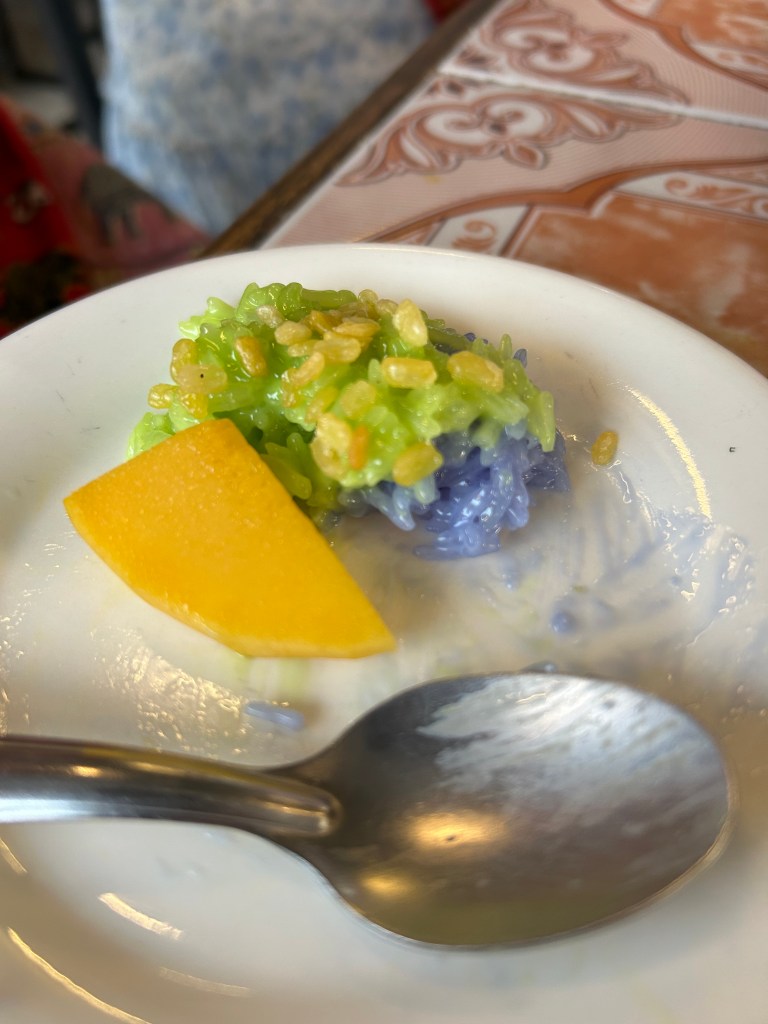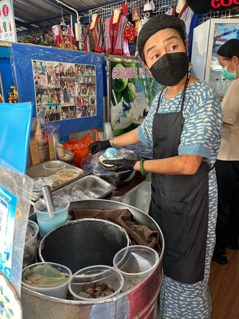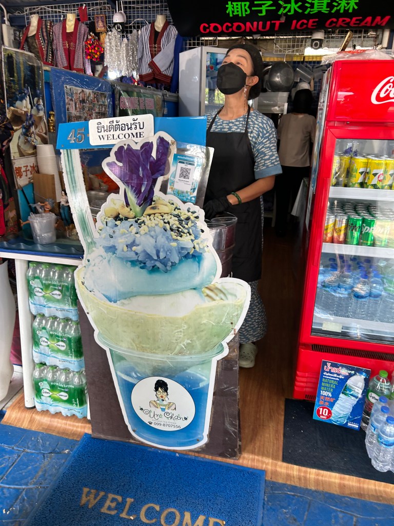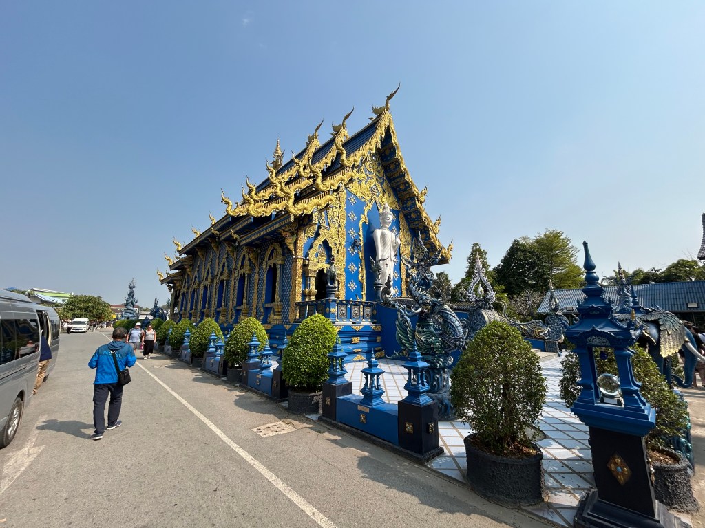 Next stop was the Blue Temple, Wat Rong Suea Ten. It was rebuilt and decorated by an artist who trained with the White Temple master. The painting style was similar. The imagery was not. It was beautiful with its blue and gold interior. Beside the Blue Temple was an ice cream shop serving up blue coconut ice cream. Our tour guide said we shouldn’t miss it. He was right! Coconut Ice Cream infused with butterfly pea for the blue, blue coconut sticky rice, topped with peanuts and sesame. Served in fresh coconut shell with soft shards of coconut scraped from the sides of the bowl. Also served with a small glass of fresh light blue coconut water. Blue temple was good. Blue Ice Cream was great!