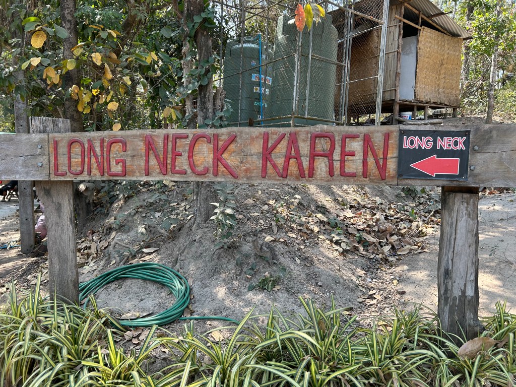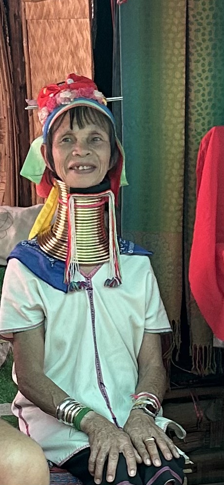 After Doi Suthep, Andy asked if we were interested in the Long Necks. While he was driving, I googled them a little concerned that we were headed to a place where people were displayed against their will. This tribe were Kayan (Karen) refugees who left being persecuted in Myanmar. As refugees they had no source of income and no way to work legally. A tourism representative consulted the women of the village to see if they would allow people come to see them and their cultural anomaly with an admission ticket. Approval meant they could also sell their artworks and weavings. And now they have a network of small and very primitive villages throughout Northern Thailand that have become a destination to see them, talk to them and take a picture with them. We paid Andy 600 Baht for the two of us to go in. He said otherwise we would pay $500 each. The old ladies had the longest necks, most sloped shoulders and were very thin.