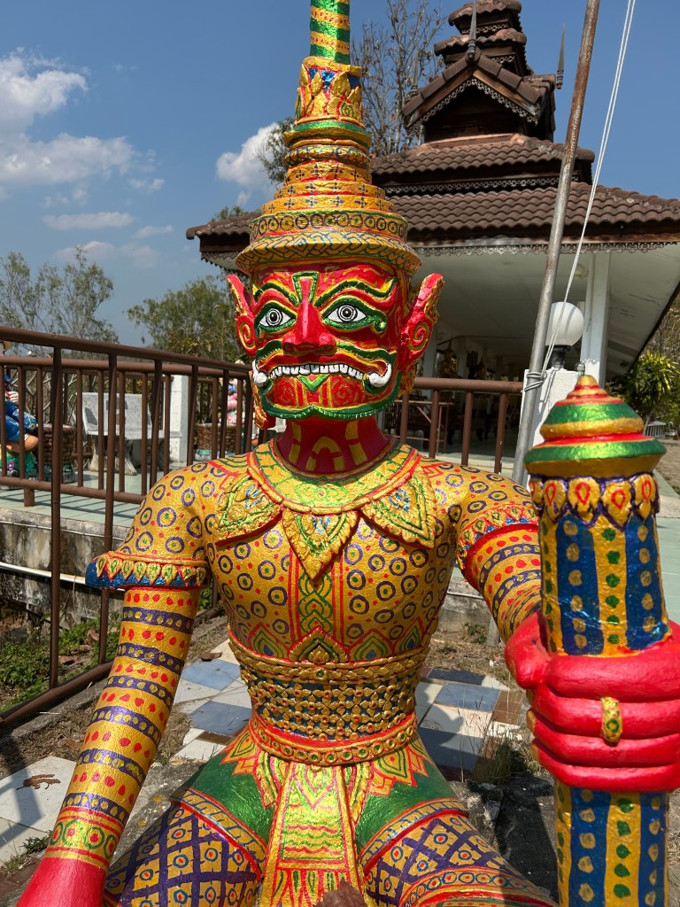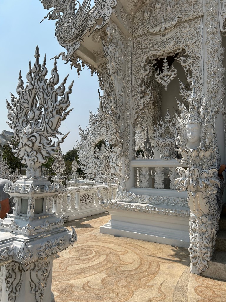 After that the bus offered anyone to go to the Long Neck Karens. A different group than the ones we had seen the day before. Only 300 Baht each! We hung out at the bus. We arrived at the Wat Rong Khun, The White Temple, and our tour guide explained that the temple was built recently by master Thai artist Chalermchai Kositpipat. Build it and they will come seemed to be the motivation here. As tourism soared, a new freeway/ motorway is being built slowing the present flow of traffic but a new destination is being delivered to the masses. And it was impressive. We were informed that outside the temple we could take pictures but his paintings inside were not to be photographed. The inside was very interesting and had modern imagery of iconic superheroes including Elvis, MJ, Teenage Mutant Ninja Turtles, Jack Sparrow, Yoda, Harry Potter and many Marvel heroes. There was also an image of the NYC twin towers on fire before they fell. The message, of course, was to trust the Buddha path of enlightenment and that false idols could not prevent disaster or provide sanctuary. I imagine if you are interested there are official photos online with deeper interpretations. Outside it was white with many mirrors. Walking through purgatory before entering the temple and paradise. Lots of messaging. And lots of tourists. One way traffic. Build it and they will come.