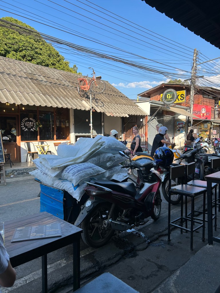 We weren’t sure if we were in a busy market or if this was just the vibe. It was both. The average age around us was about 24. Scooter shops renting to everyone were everywhere. Tour companies offering multiple sights in one trip including river tubing parties, waterfall and temple hikes. In between were loud bars, pot shops, coffee shops, restaurants, clothing stores, food carts, and stray dogs. The 24 year olds were getting their feet wet in the hostel and travel scene. Some wanted to be stoners, some meditation seekers, and some just curious. All wanted to ride scooters. And they did. What did we do? Deb had a cold so we were pretty slow motion. We walked the roads and found a lovely spot to sip a beer before the nightly walking market opened and the street vendors closed the road …well not really, as tourist vans, mini busses and motor bikes snaked through the crowded streets giving the street market vibe an uneasy edge. We loved this part and the street food was good and inexpensive.