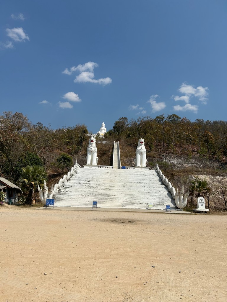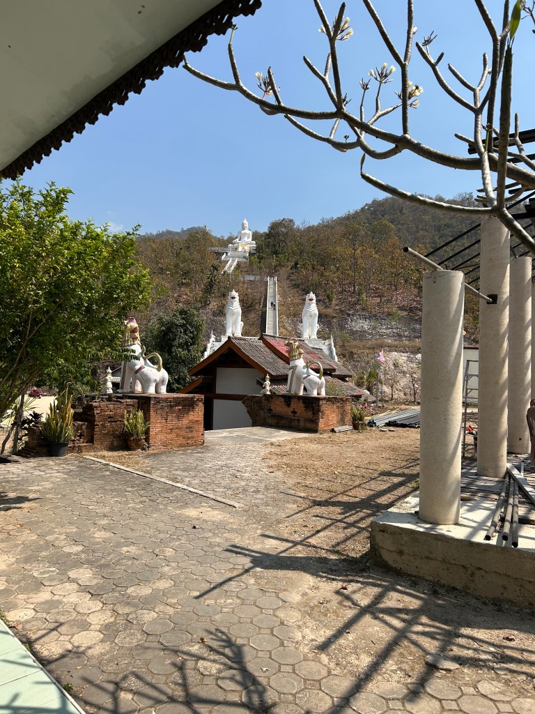 The walk up to the White Bhudda was about a 5 k return. Not far but hot and I counted 325 steps to get to the temple below. Another 300 awaited us to go up. BUT I got busted starting up the steps as my shorts that almost but not quite cover my knees were not appropriate and I forgot my sarong to complete my cover up plan.
