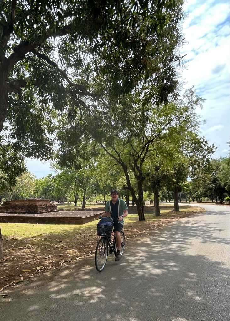 Arriving in Sukhothai we were picked up and whisked to our guesthouse in the old city right across the street from the Sukhothai Historical Park, a UNESCO world heritage site. Sukhothai was a large empire, and this was the center of the Thai universe before it became Thailand. The evening that we arrived had a street market along the water-way by the temple with mats and tables to enjoy the food. We met a couple about our age from Creston, BC in Canada and had a mini visit with them. Next day we used bikes from our guest house to tour the park with. Ms Aom had arranged this. Check!