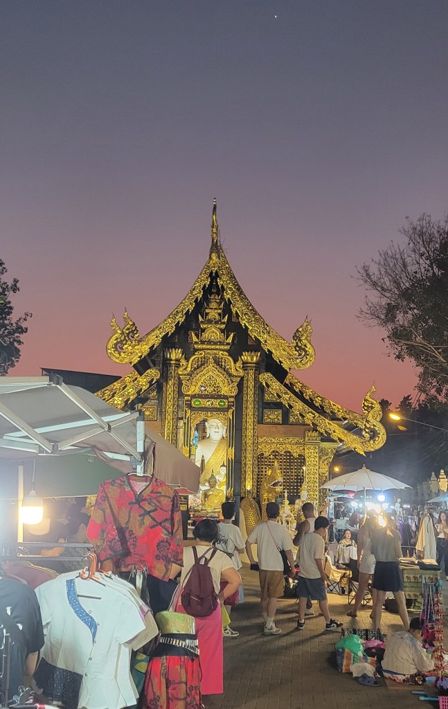 We visited Wat Chedi Luang which blended a new temple with a ruin of an old, original temple, in fact the oldest temple in Chang Mai. The central square has a statue of the three kings who take credit for developing and establishing Chiang Mai back in the 1200s. While wanderings these places we noticed the city workers were blocking off roadways, setting up sound systems, food and clothing stalls were setting up and an obvious event was about to happen. Cool. Ms Aom had said we can go to the Chiang Mai Walking Street in our minute trip organizing time, and we realized they were setting up for this. We headed back for a rest and to cool off in some AC. At 7pm the streets were in full swing, the center square under the three kings had a stage with traditional Thai dancers, music was blaring, smoke from chargrills was whispping through the throngs. They did this every Sunday! WOW.