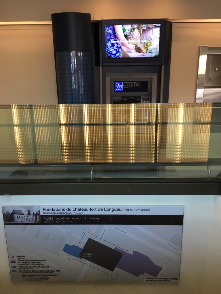 Down the main street, there was remains of an old castle that had been renovated into apartments. Across the road, the Royal Bank (Banque Royale) had a museum in the instant-teller space. Below a large glassed in hole was the remnant of the well that serviced the castle. This was difficult to take a good picture of. But suffice to say, this was the most interesting bank machine stop I have ever experienced.